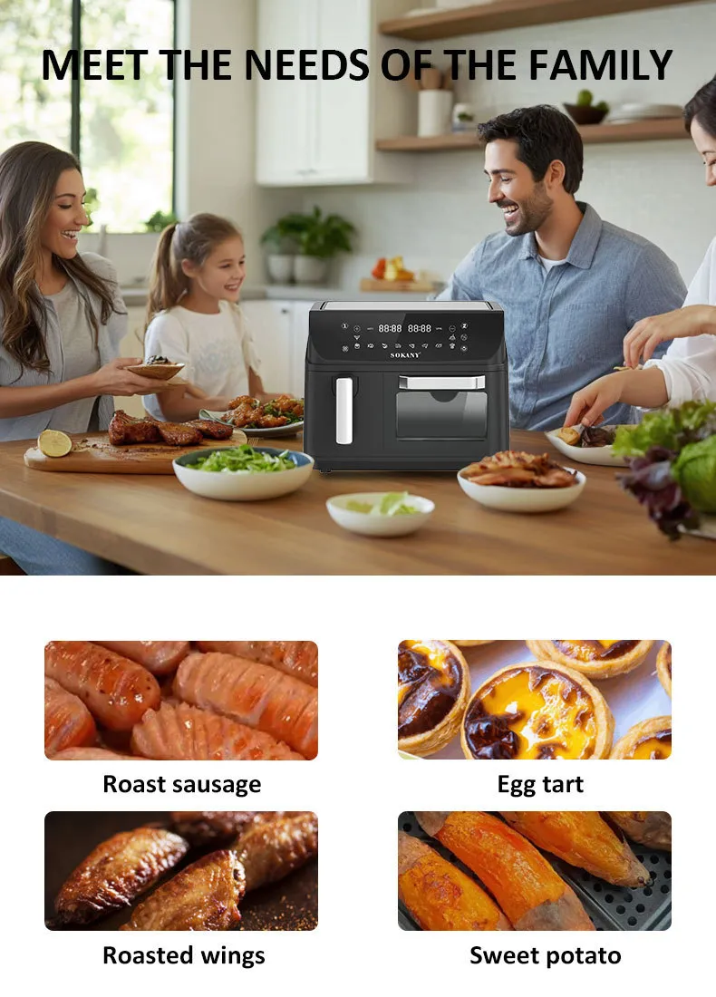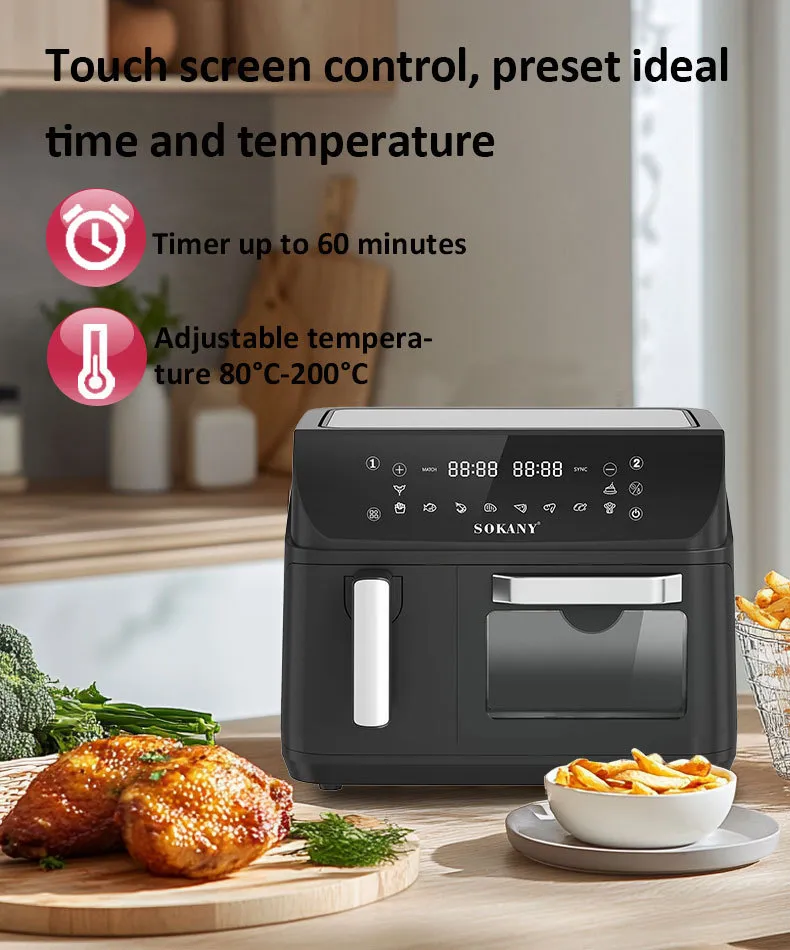 The SOKANY10060 Air Fryer is a state-of-the-art kitchen appliance designed to revolutionize your cooking experience. With its impressive 12.5L capacity, dual-pot functionality, and advanced visualization features, this air fryer offers a healthier and more efficient way to prepare your favorite meals. Whether you're cooking for a large family or entertaining guests, the SOKANY10060 ensures that every dish is cooked to perfection with minimal oil, preserving the natural flavors and nutrients of your ingredients.