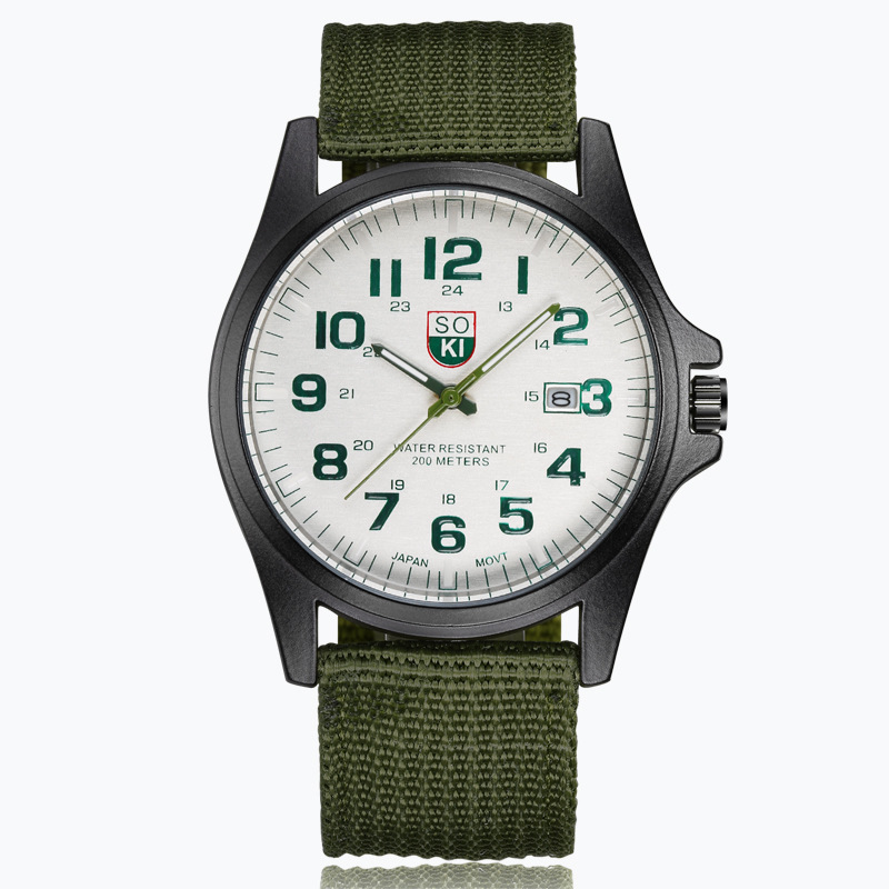 The woven nylon strap on the SOKI military watch is adjustable, allowing you to find the perfect fit for your wrist. The adjustable design ensures that the watch stays secure without feeling too tight or too loose, providing both comfort and stability. This feature makes the watch suitable for a variety of wrist sizes, offering a comfortable and secure fit for all-day wear.