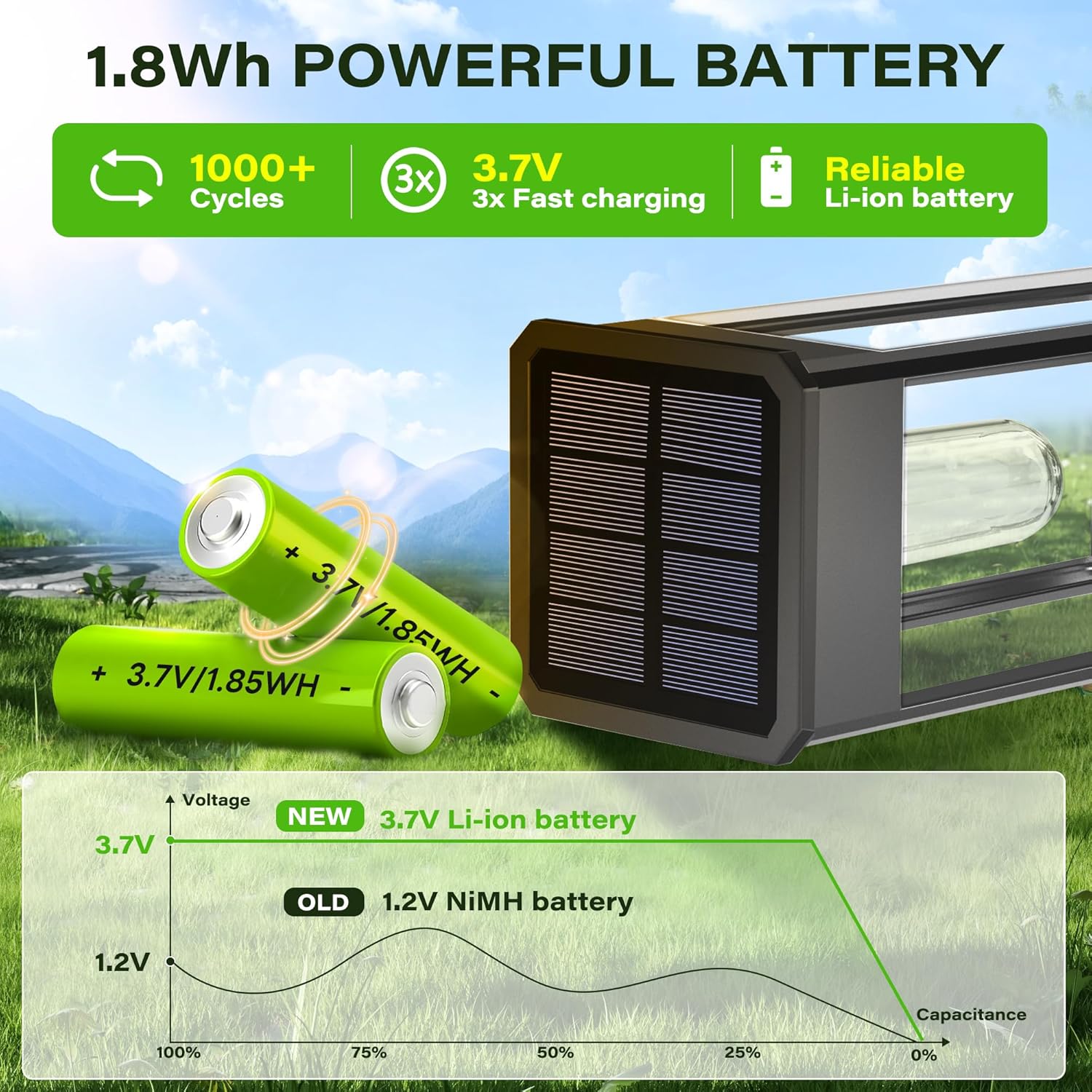 Self-Charging Solar Power: Harnesses free sunlight to store energy in rechargeable batteries — no wiring or electricity costs.