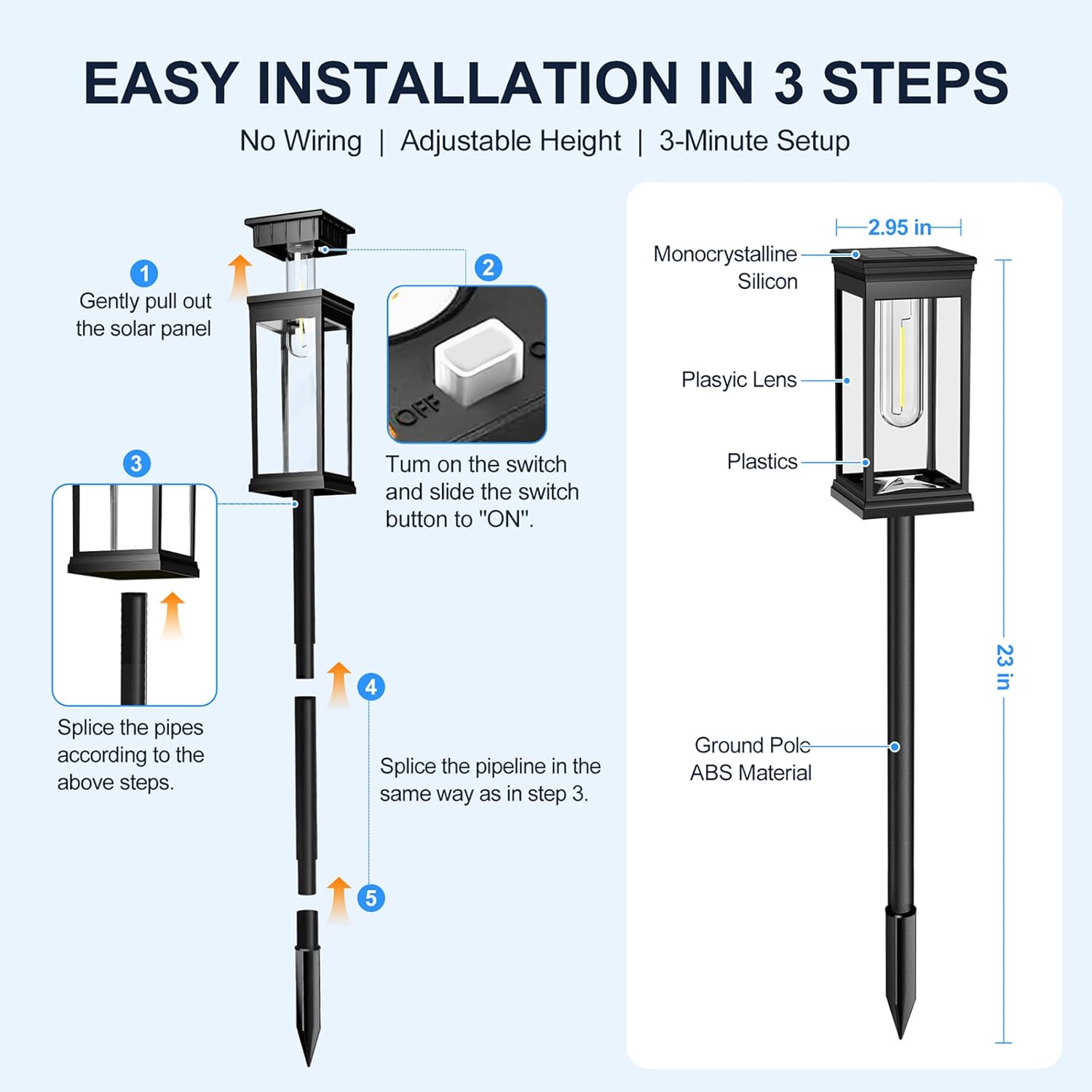 Simply connect the stake, pole, and solar light, then insert the solar lights into the ground or lawn. Ensure these