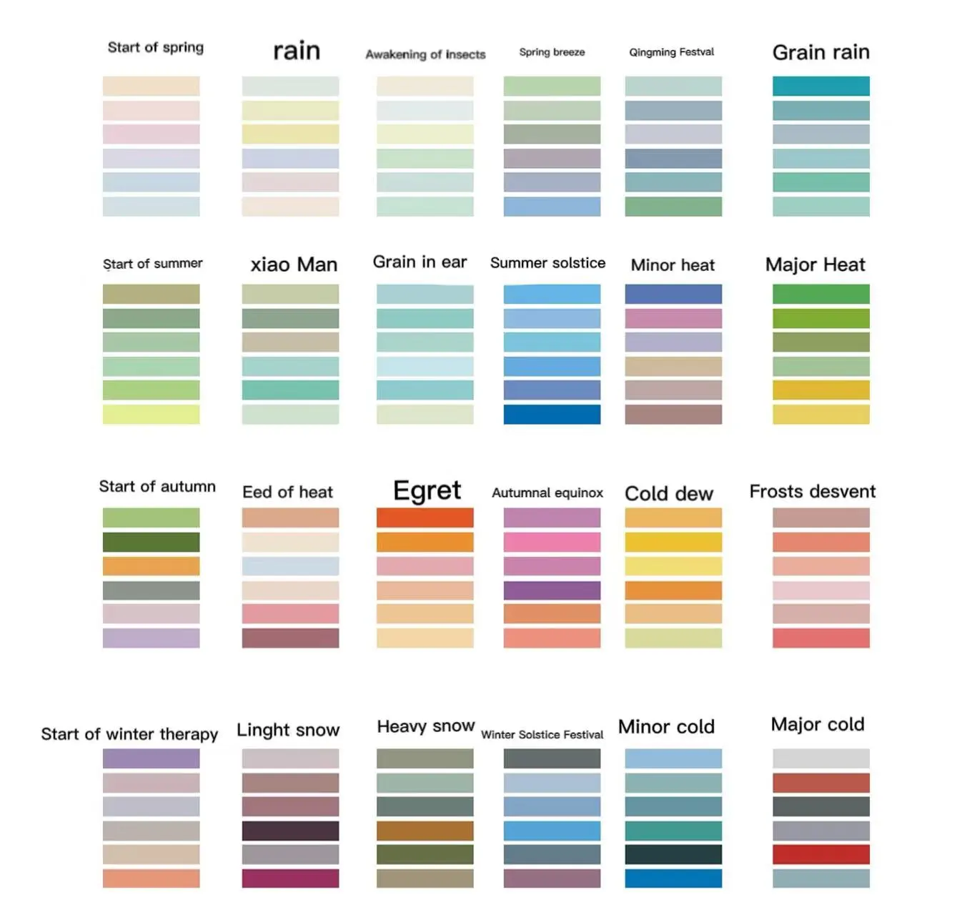 Color classification: 1. Start of Spring 2. Rain 3. Awakening of Insects 4. Spring Equinox 5. Qingming 6. Grain Rain 7. Start of summer 8.
