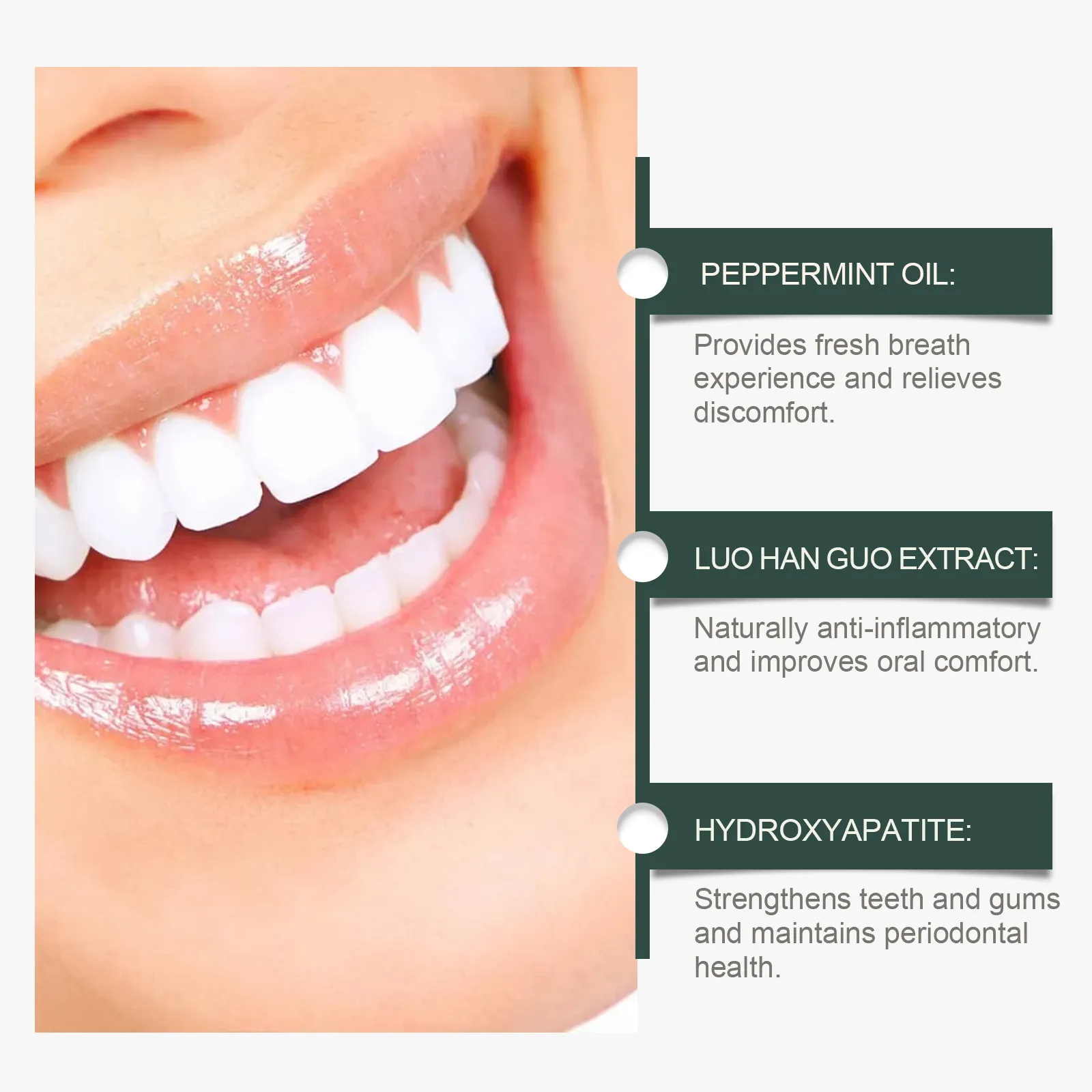 Composición: agua, aceite de menta, extracto de Momordica grosvenori, hidroxiapatita, óxido de zinc