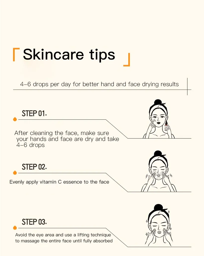 1. Ilumina el tono de la piel: El uso regular de nuestro sérum ayuda a disminuir la apariencia de opacidad, revelando una tez más radiante. Combate los signos del envejecimiento: La vitamina C reduce la apariencia de líneas finas y arrugas, promoviendo una luminosidad juvenil y saludable. Hidrata y nutre: Con ácido hialurónico añadido, este sérum asegura que tu piel se mantenga hidratada, suave y flexible. Protege contra el daño: Los antioxidantes en la vitamina C ayudan a defender tu piel contra los radicales libres y los estresores ambientales. Para obtener mejores resultados, aplica unas gotas de la solución para el cuidado facial con vitamina C sobre la piel limpia por la mañana. y por la noche. Masajee suavemente en el rostro y el cuello, dejando que se absorba por completo antes de aplicar la crema hidratante y el protector solar.