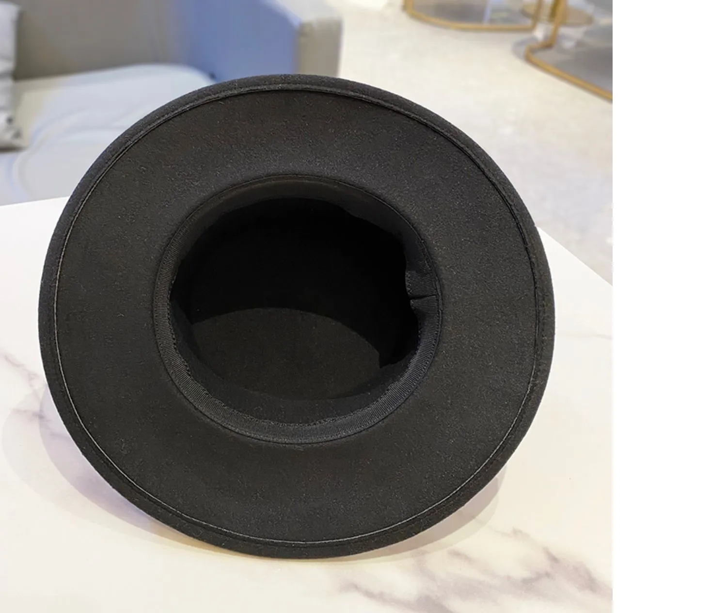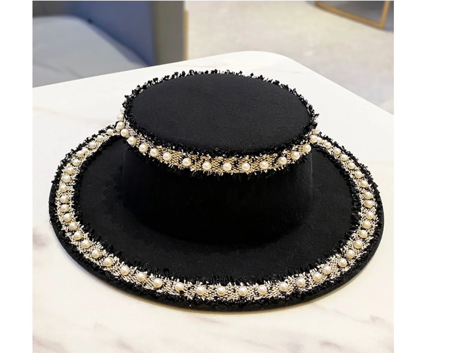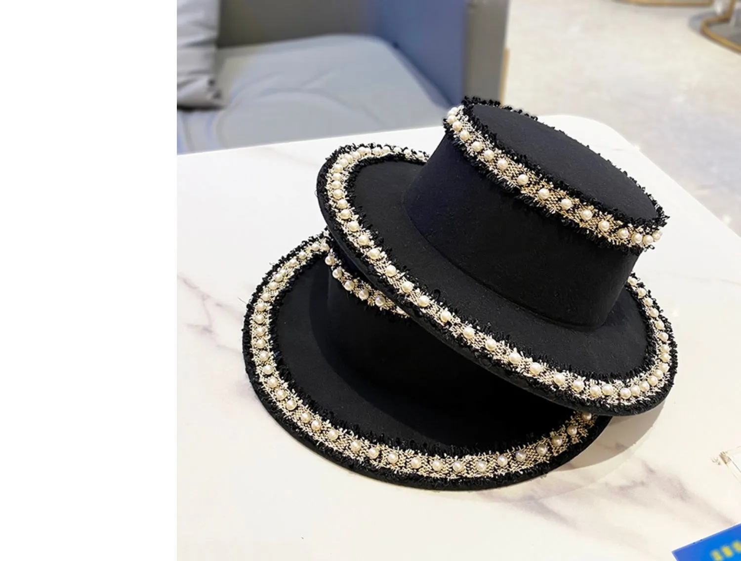 Sombrero de lana para mujer, sombrero de copa plano con perla, sombrero de pescador