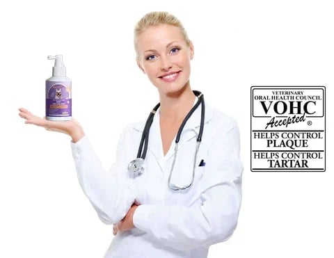 Nuestro espray es el producto más reciente certificado por VOHC. Sin efectos secundarios. Hecho con hierbas 100% naturales. Apto para mascotas, incluyendo perros y gatos. En realidad, funciona mejor que los huesos para el aliento de perros, las golosinas refrescantes, las mentas refrescantes para el aliento para perros, los masticables dentales, el enjuague bucal para perros u otros productos para la limpieza y el cuidado dental de los dientes de los perros.