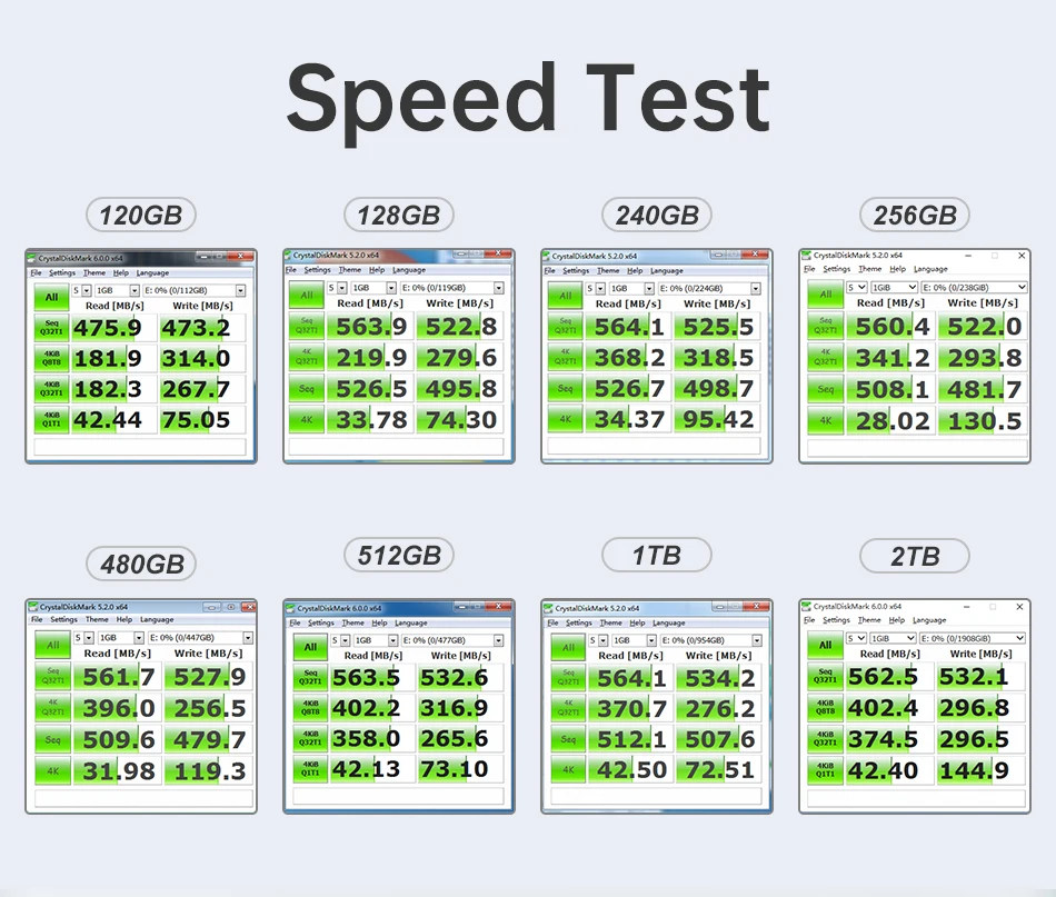 Fit for most of the computers. 10 times faster than HDD, the speed can up to 550Mb/s.