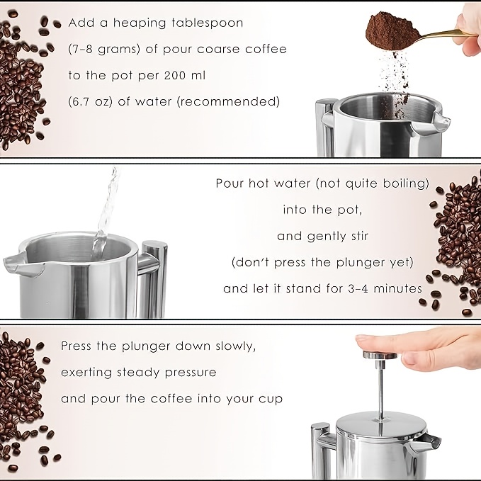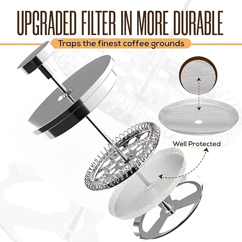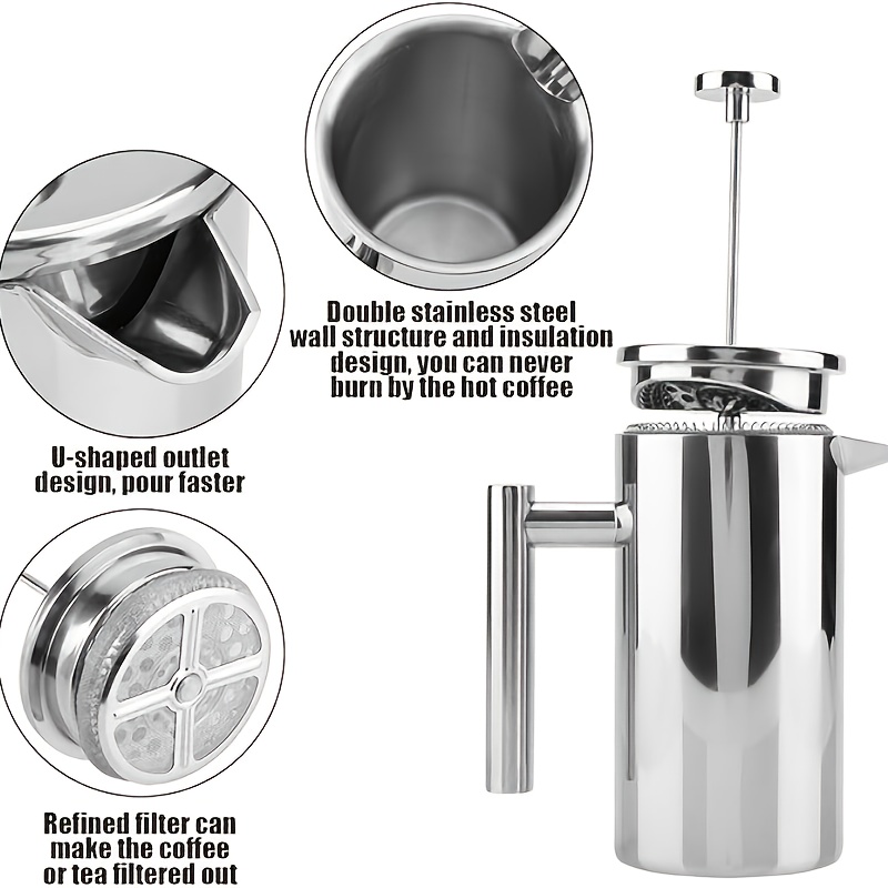 The Stainless Steel French Press Coffee Maker is an essential tool for anyone who enjoys rich and flavourful coffee. With its durable design, easy operation, and excellent brewing performance, it offers a simple yet effective way to make high-quality coffee. Whether at home or on the go, it provides a satisfying and reliable coffee experience.