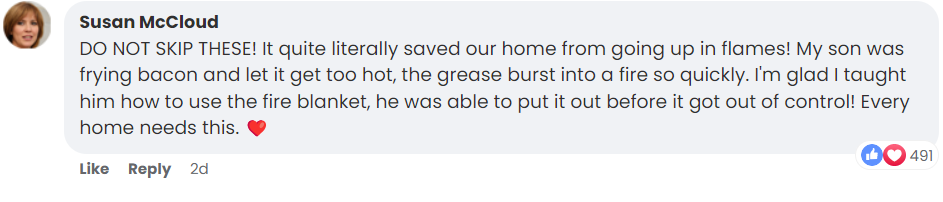 "DO NOT SKIP THESE! It quite literally saved our home from going up in flames! My son was frying bacon and let it get too hot, the grease burst into a fire so quickly. I'm glad I taught him how to use the fire blanket, he was able to put it out before it got out of control! Every home needs this."