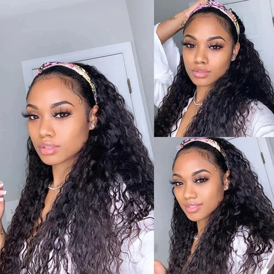 Stretched Length: 16inches, Density: 180% - Deep Wave Headband Wig Indian Human Hair Full Machine Made Wigs 200 Density For Women Easy Go Water Scarf Wigs 12-24 Inch Wig