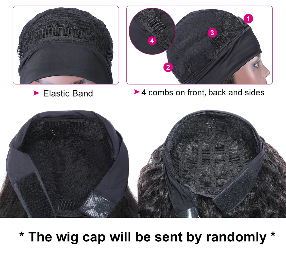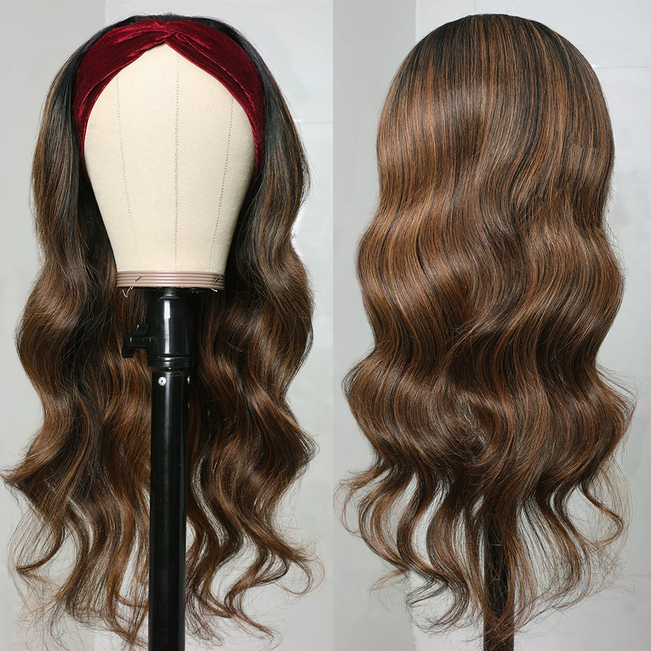 Stretched Length: 24inches - Black Balayage Headband Wig Human Hair Body Wave Highlight Wig Put On & Go Glueless Human Hair Wigs with Pre-attached Scarf