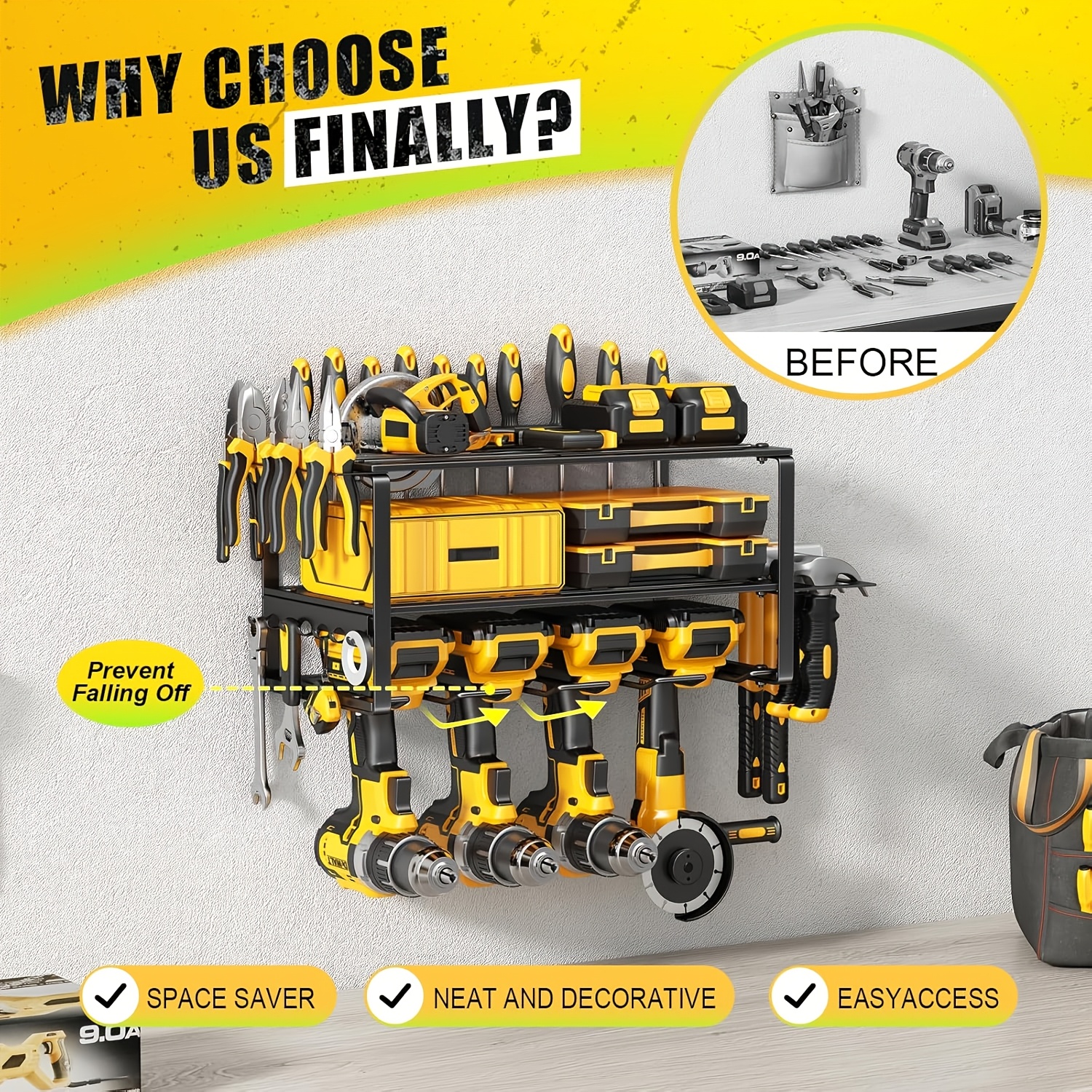 Easy Access: With all your power tools neatly organized and displayed, you can easily find what you need without wasting time searching through cluttered drawers or bins.