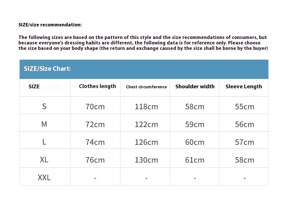 Nota: 1. Las tallas asiáticas son 1 o 2 tallas más pequeñas que las europeas y americanas. Elige la talla más grande si tu talla está entre dos tallas. Puede haber una diferencia de 2-3 cm debido a la medición manual. 2. Consulta la tabla de tallas cuidadosamente antes de comprar. Si no sabes cómo elegir la talla, contacta con nuestro servicio de atención al cliente. 3. Como sabes, los colores se muestran de forma diferente en cada ordenador, por lo que el color del artículo real puede variar ligeramente del de las siguientes imágenes.Lista de empaque: