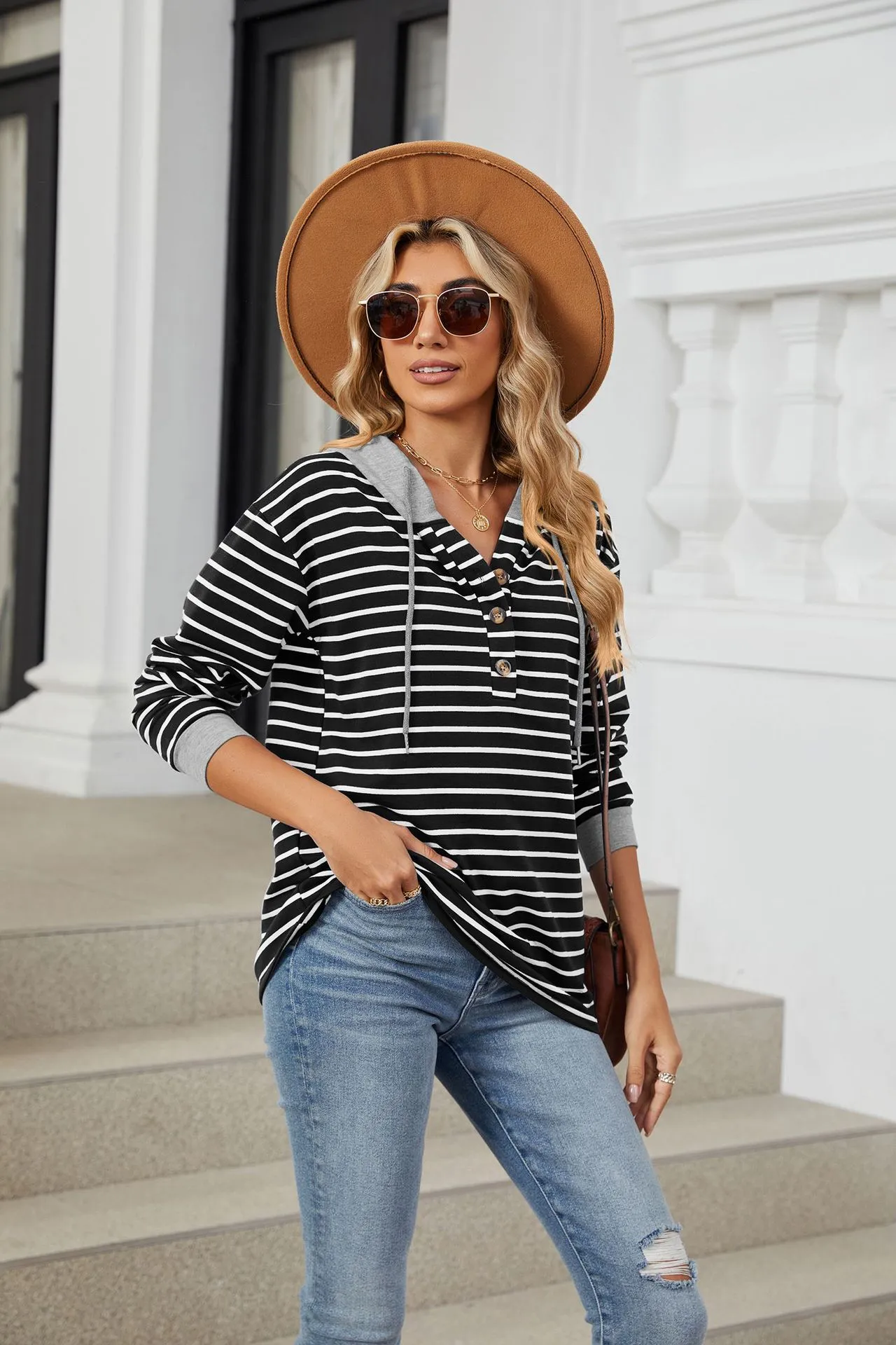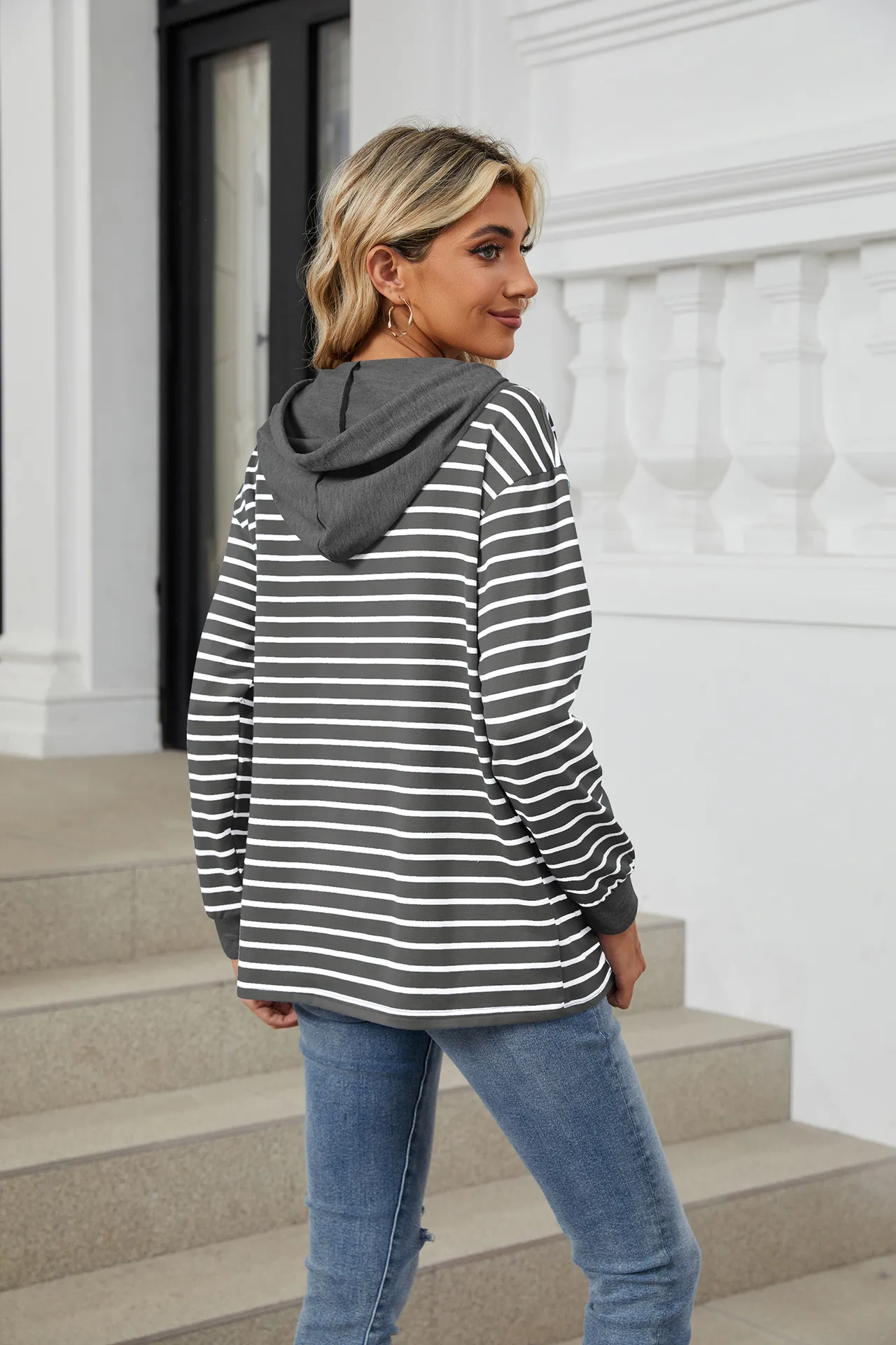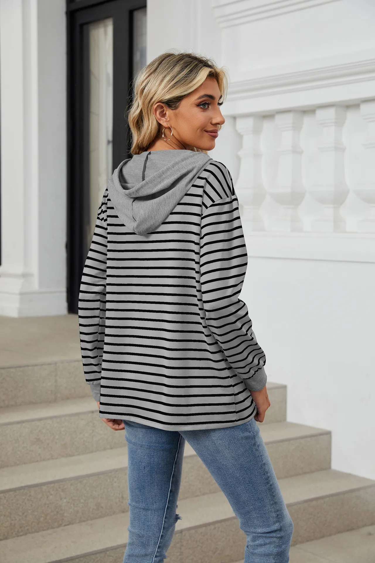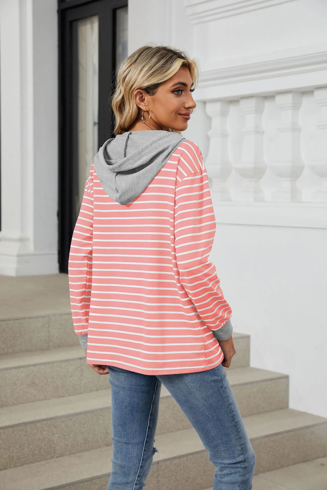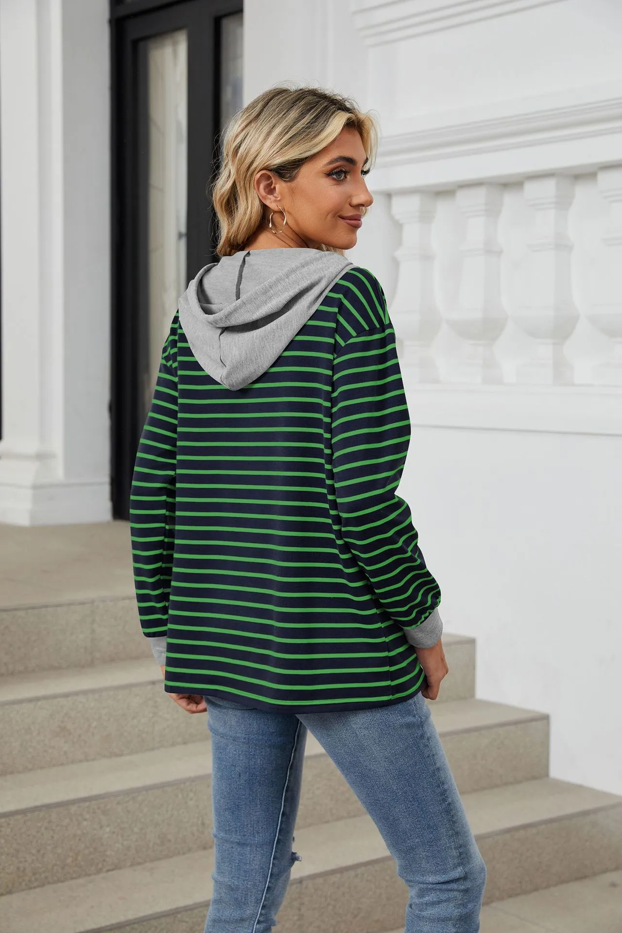 Sudadera holgada de manga larga con capucha y patchwork de colores contrastantes a rayas para mujer