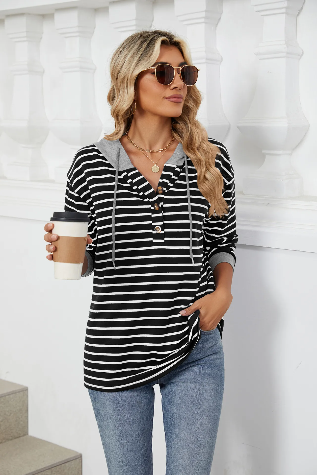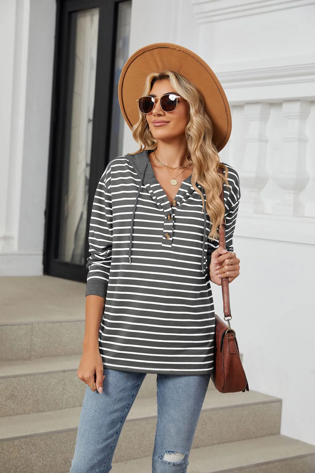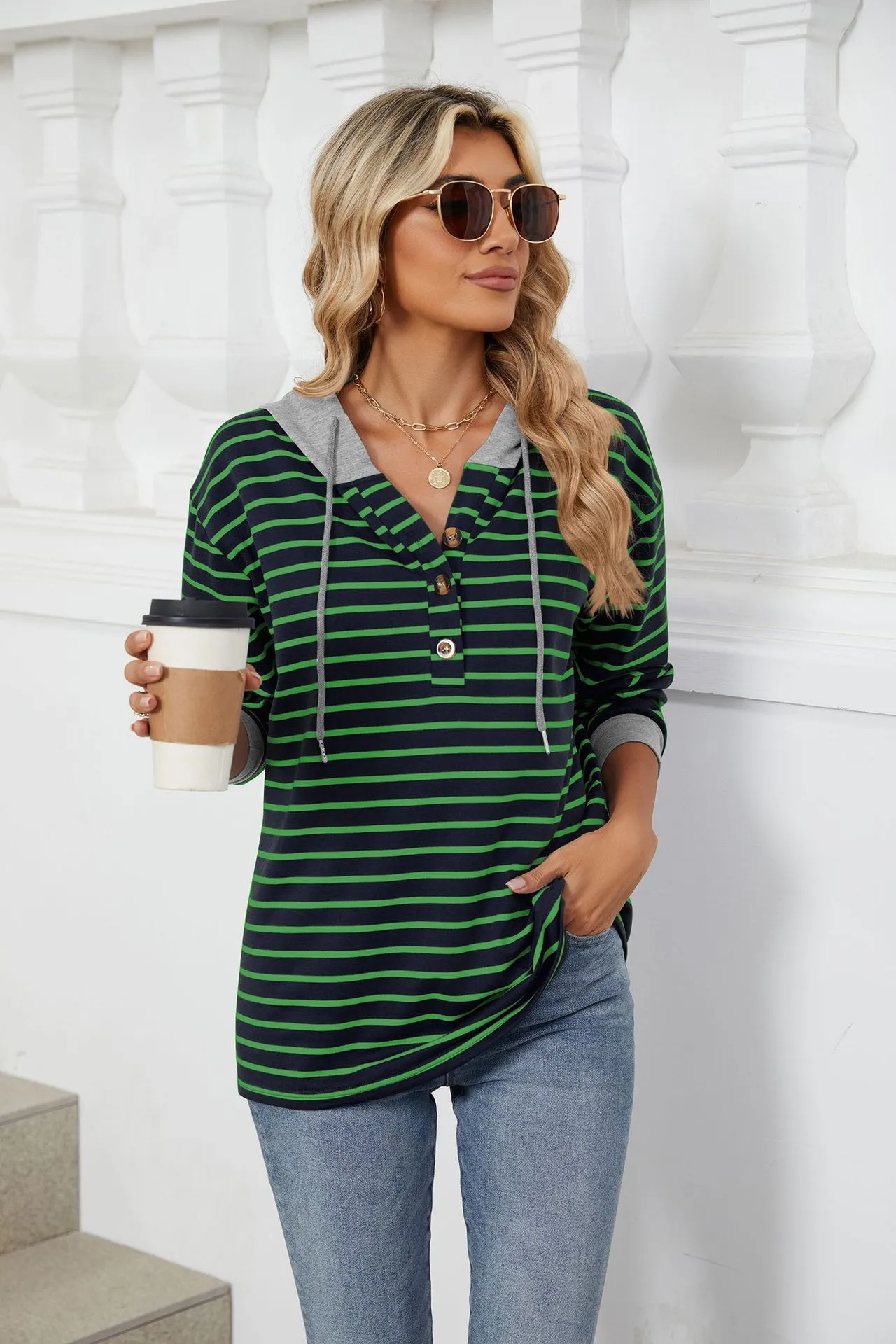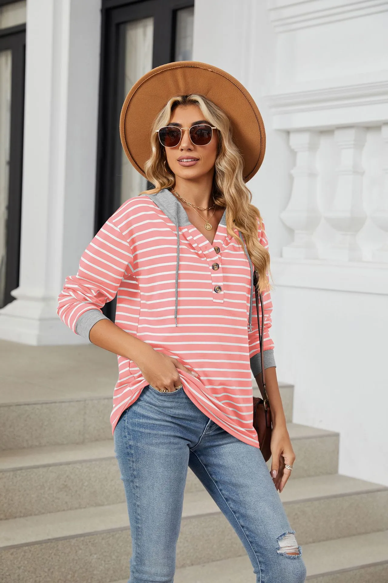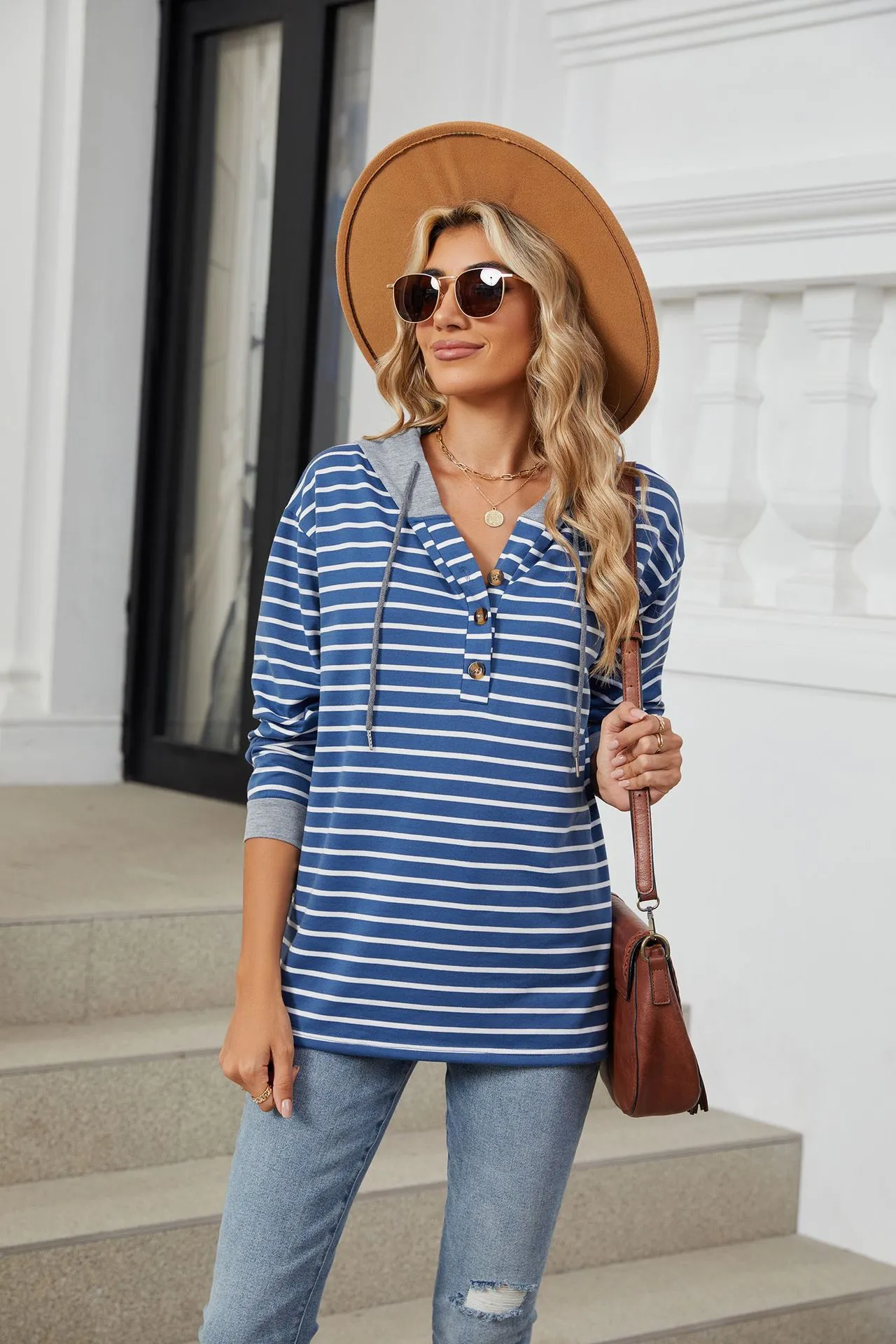 Sudadera holgada de manga larga con capucha y patchwork de colores contrastantes a rayas para mujer
