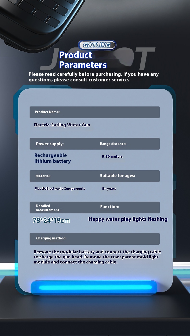 This electric Gatling water gun is designed to deliver powerful, continuous blasts of water, giving players an advantage in any water fight. Unlike traditional water guns that require manual pumping, this electric model offers effortless play, letting users focus on their aim and strategy. The steady water stream and long-range capabilities make it easy to soak opponents, adding excitement to every spray.