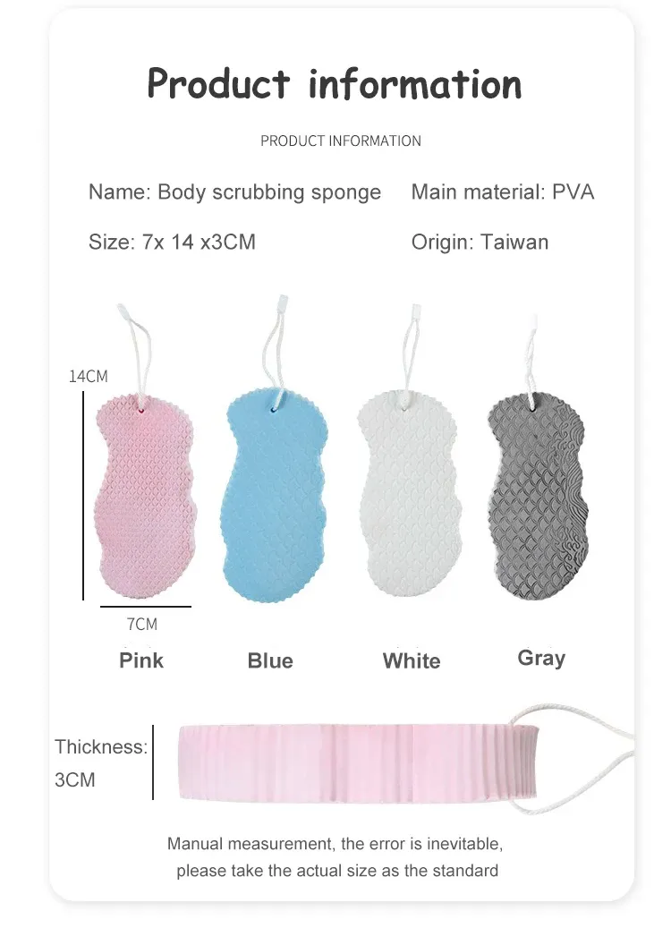Made with soft PVA material,The super-soft bath sponge is used to clean stubborn horniness, dead skin and stains, This exfoliating bath sponge is perfect for both adults and children, as well as for Pregnant Women and seniors.