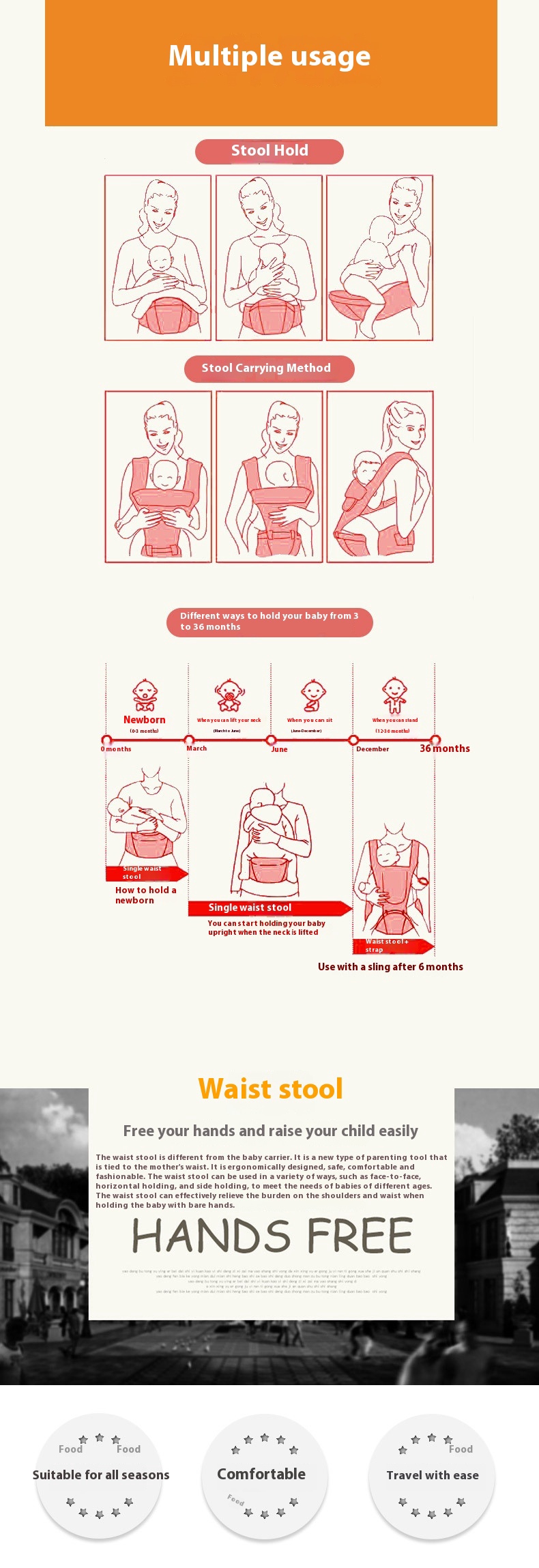 El taburete multifuncional de algodón para la cintura y la correa para el hombro para bebé es un accesorio versátil y práctico diseñado para que llevar a su bebé sea más fácil y cómodo. Hecho de algodón suave y duradero, este taburete de cintura ofrece una opción de soporte de cintura y una configuración de correa para el hombro, lo que proporciona flexibilidad y comodidad para los padres en movimiento.
