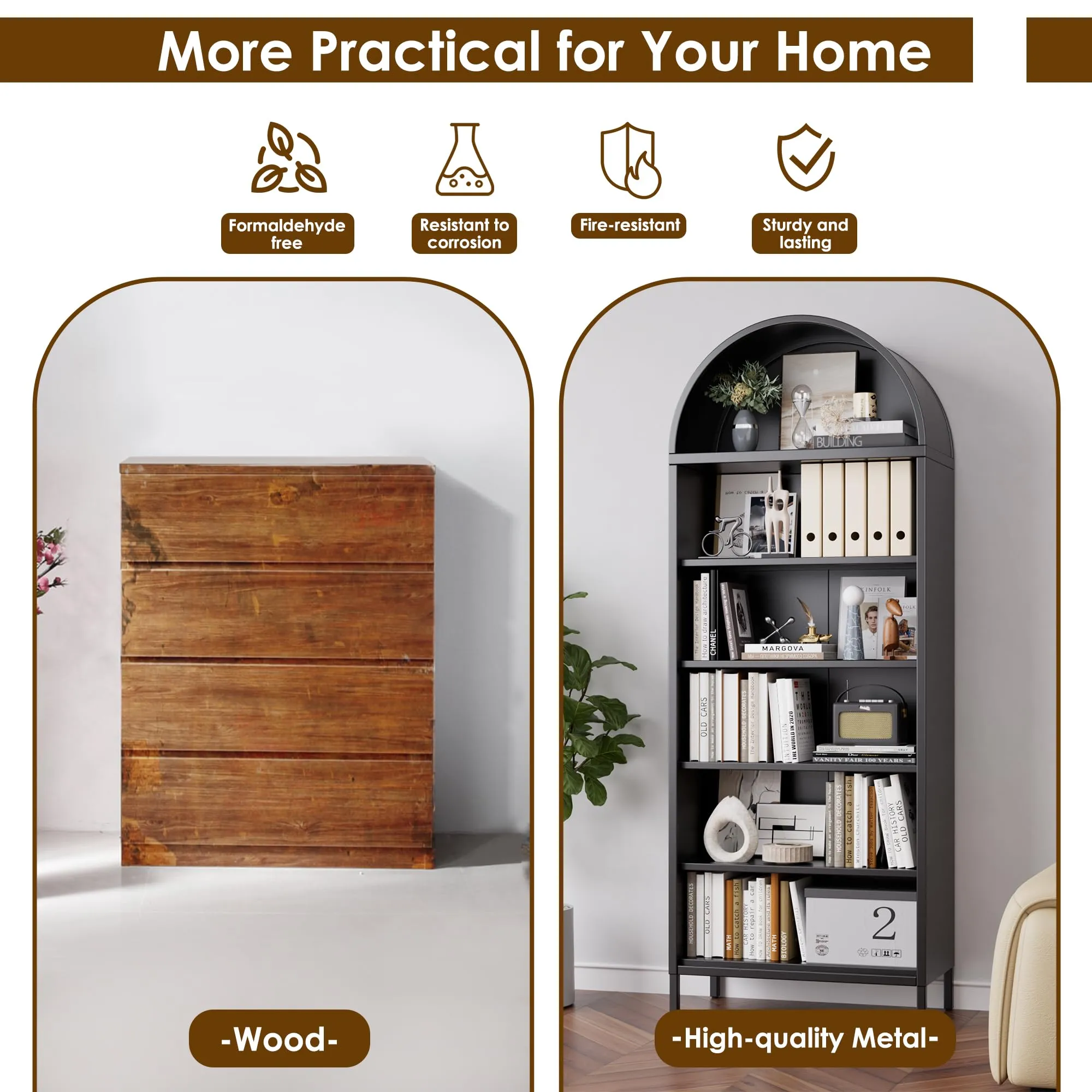 - Elevate your study storage with our tall arched bookcase. Its surface is treated with electrostatic powder coating, ensuring it is odorless, formaldehyde-free, fire-resistant, waterproof, and moisture-proof for a truly healthy and safe environment.