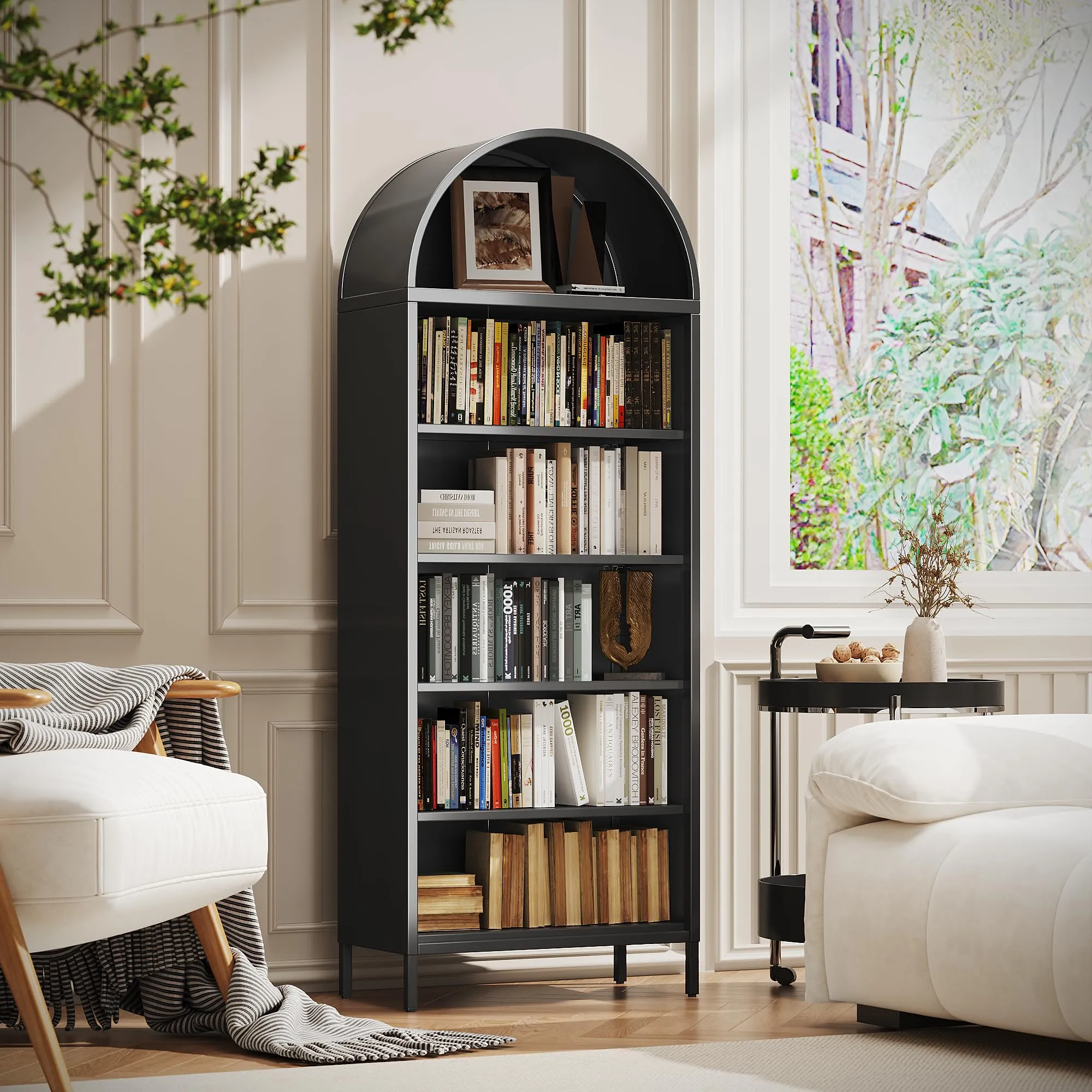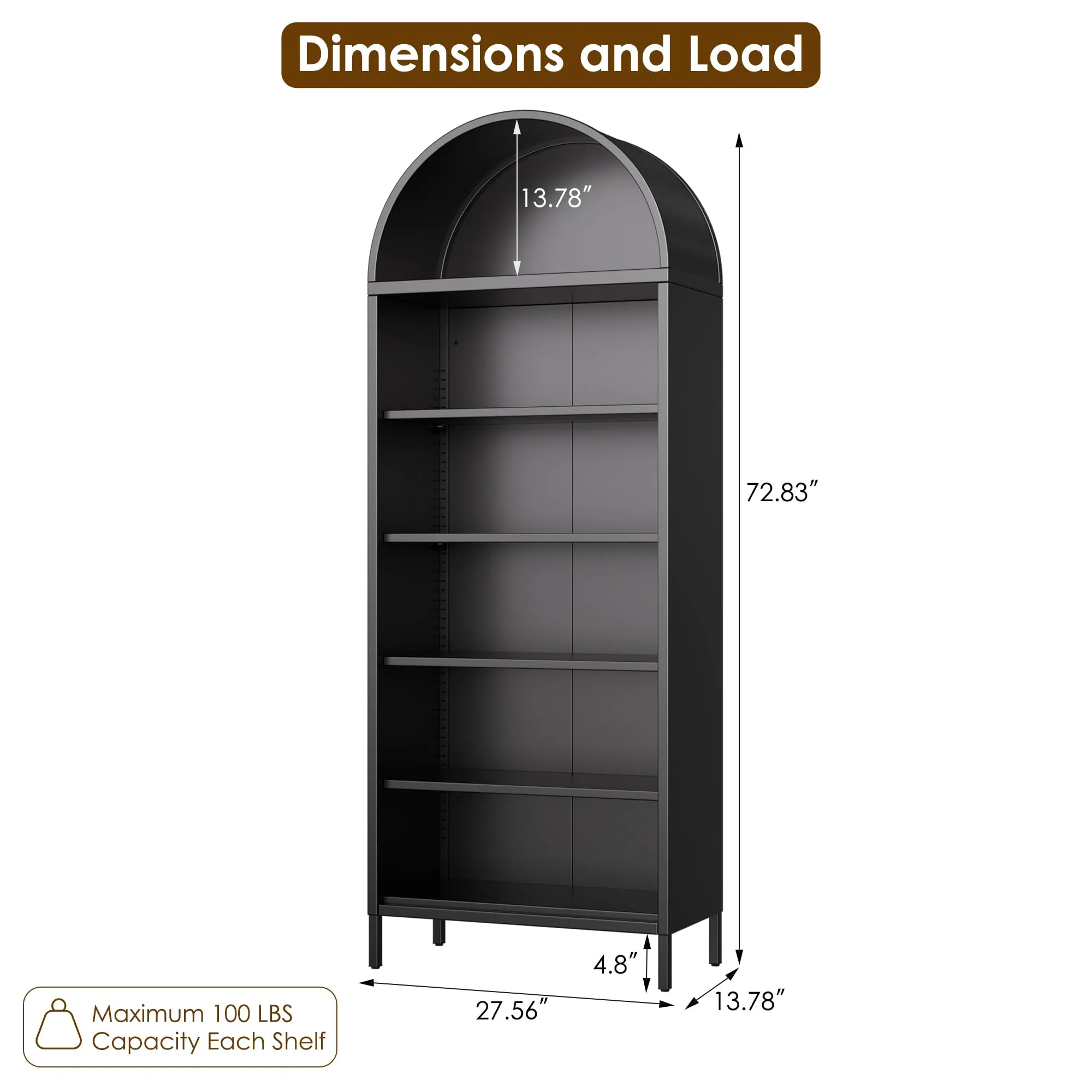 - Crafted from durable metal material, this robust arched cabinet bookshelf offers exceptional strength. Each of its shelves provides a remarkable load-bearing capacity of 150 lbs for your heaviest items.