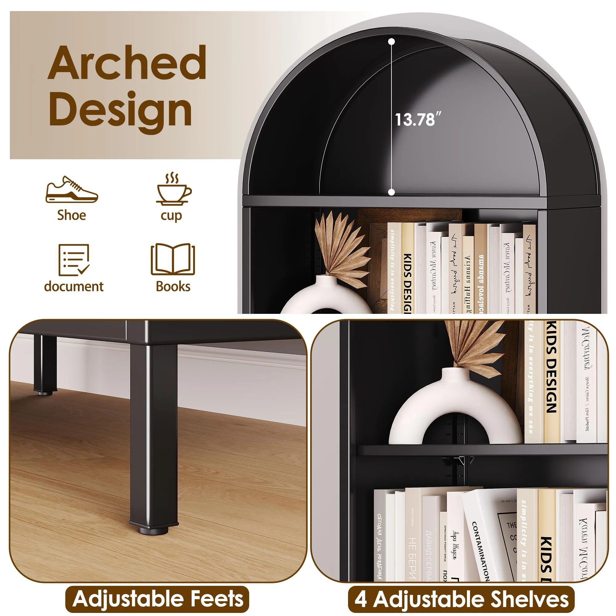 - Customize your space with this versatile round top bookshelf. It features 4 adjustable shelves and stabilizing leveling feet, allowing you to create the perfect layout on any floor. Its practical design makes it an ideal bookshelf arch solution.