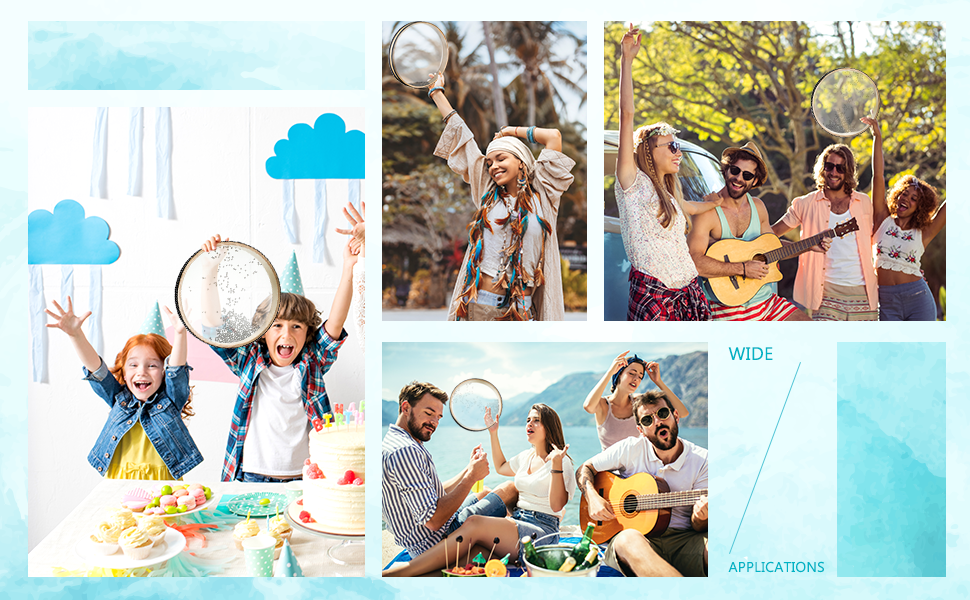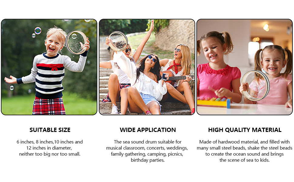 • Amplia gama de aplicaciones: el tambor de sonido del océano es un suministro ideal para el aula musical, ya sea tocando solo o con un grupo; Además, el tambor también es adecuado para conciertos, bodas, fiestas de cumpleaños, reuniones familiares, reuniones de amigos, campamentos y picnics