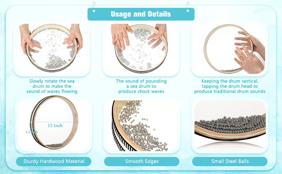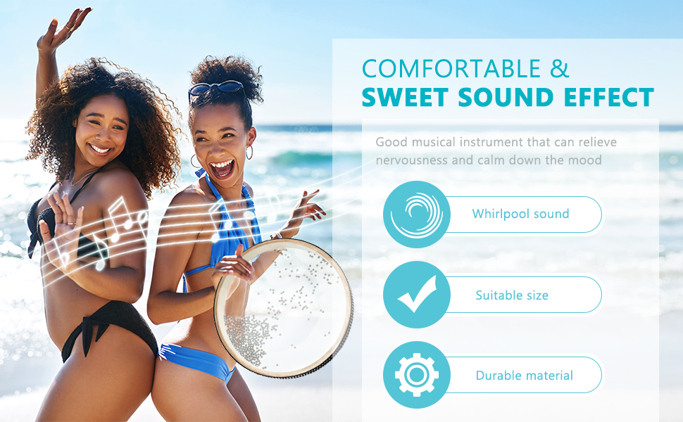 • Efecto de sonido de onda: el instrumento de tambor marino puede crear el sonido del océano con efectos de sonido giratorios, lo que puede crear un ambiente relajado y alegre, lo que le permite disfrutar de los agradables sonidos del mar azul y le da una sensación de estar en el mar