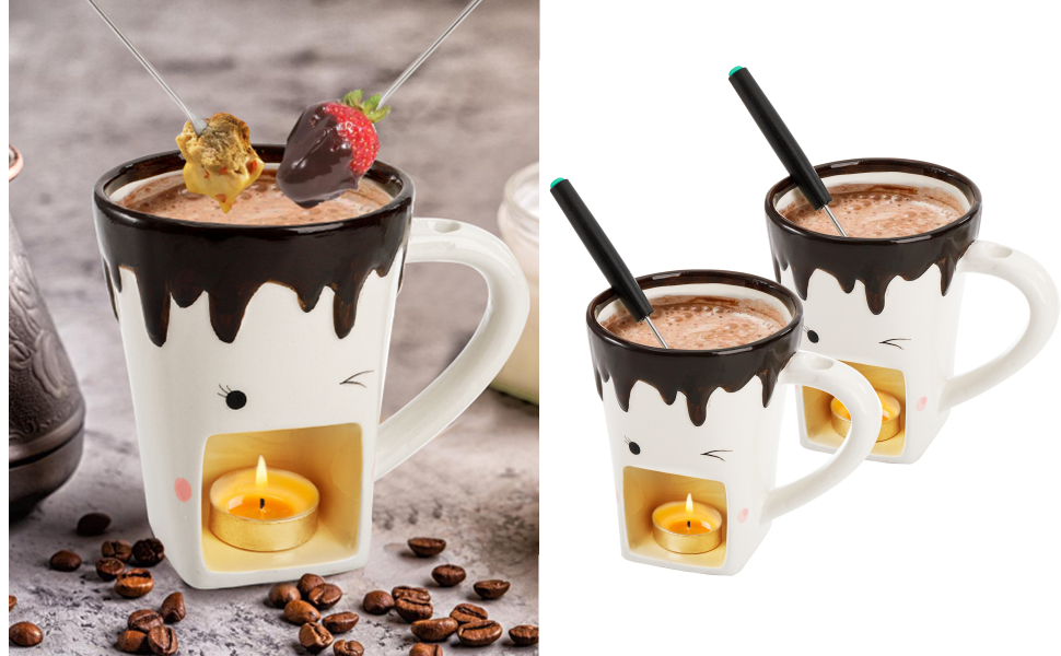- 2 juegos de tazas de cerámica para fondue con 4 tenedores de acero inoxidable, tamaño: 10 cm de diámetro superior y 12,7 cm de altura. Cada taza individual es ideal para servir a los clientes en la fiesta. Apto para lavavajillas.