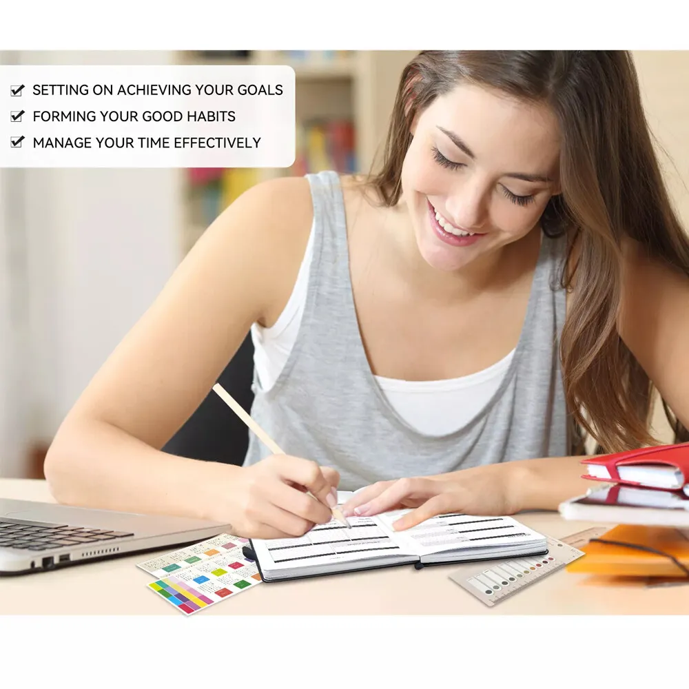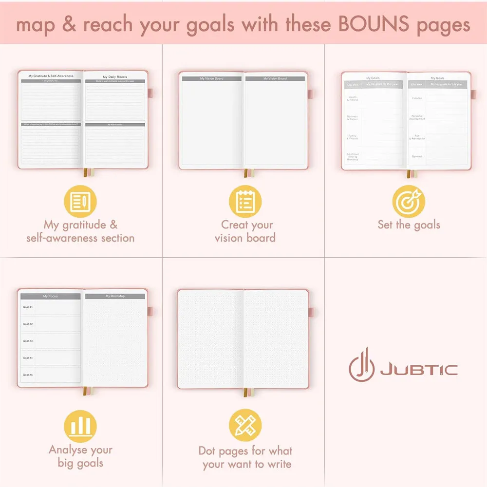 - â PERSONNAL DESIGN: JUBTIC planner is a premium quality daily journal for productivity of all planners and organizers for women and men. A5 size journal is made by hardcover vegan leather cover, elastic closure to protect your planner, three ribbons to bookmark certain pages and 4pcs bonus planner sticks at the back pocket to assist with organizing and bringing productivity to your life.