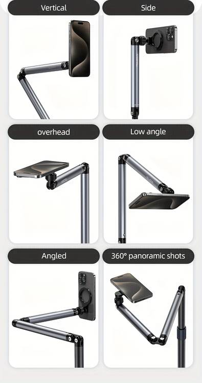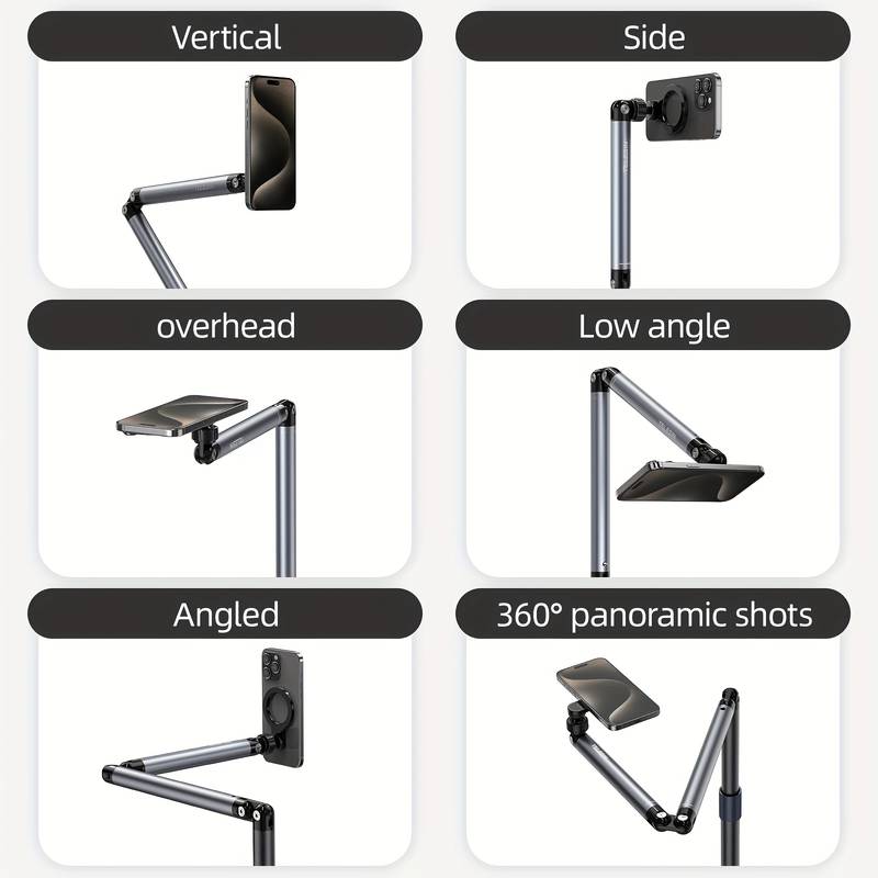 The TELESIN Floor-Standing Magnetic Phone Bracket is designed to elevate your content creation experience, offering a stable and versatile solution for video recording, vlogging, video calls, and live streaming. Made from durable aluminum alloy, this sturdy stand features a 360° rotating gimbal head, allowing you to capture multi-angle shots effortlessly. Whether you're recording a vlog, participating in a video call, or broadcasting live, this adjustable height stand ensures your phone is positioned perfectly for the best possible angle.