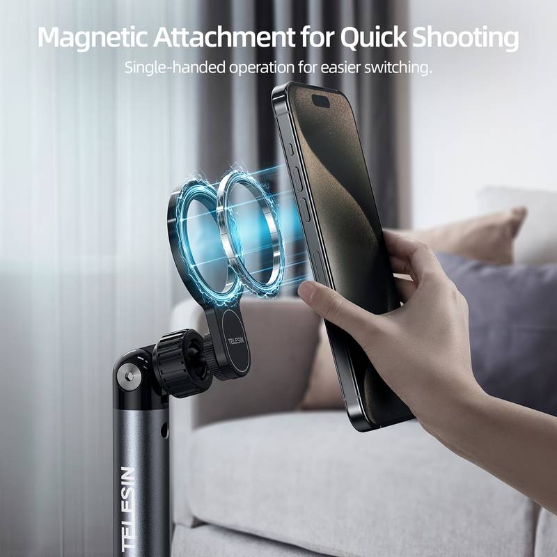The magnetic design makes it easy to attach your phone securely, and the adjustable height ensures maximum comfort and flexibility, whether you're standing, sitting, or using the stand in a different position. Compatible with both mobile phones and tablets, the TELESIN stand offers an ideal solution for hands-free filming, content creation, or professional video conferencing, all while ensuring a smooth and stable recording experience.