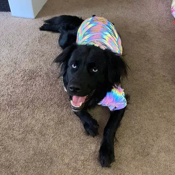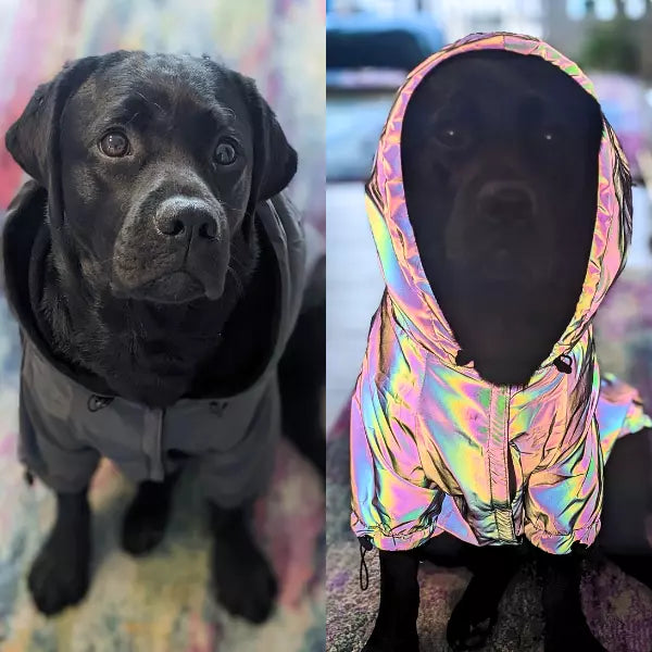 My black labrador, Joy, is impossible to see in the dark - living near a busy parkway, we just HAD to get this reflective hoodie! I am SO