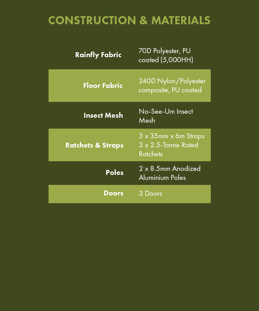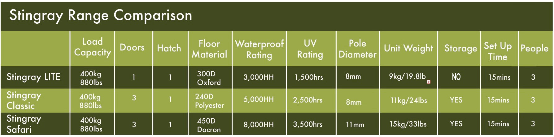 El Stingray utiliza un exclusivo sistema de anclaje de 3 puntos para crear tensión, lo que le brinda una base de tela tensa para dormir. El suelo de la tienda tiene la elasticidad perfecta para amortiguar y acunar tu cuerpo, brindándote la noche de sueño más cómoda que jamás hayas tenido en una tienda de campaña o hamaca. Tres puertas de entrada, además de una trampilla central en el suelo, facilitan el acceso a todas las áreas de la tienda. El suelo de la tienda está fabricado con una mezcla de poliéster y nailon 290D antidesgarro con más de 20 m de cinta de refuerzo para cinturones de seguridad. Esta característica patentada no solo refuerza la tienda, sino que también crea compartimentos para dormir separados y ajustables para cada ocupante, evitando que ambos rueden hasta el centro de la tienda. Las correas debajo del piso se pueden calibrar para equilibrar cualquier diferencia de peso.