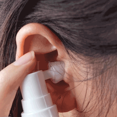 - Hold the bottle upright and carefully place the nozzle near the entrance of your affected ear.