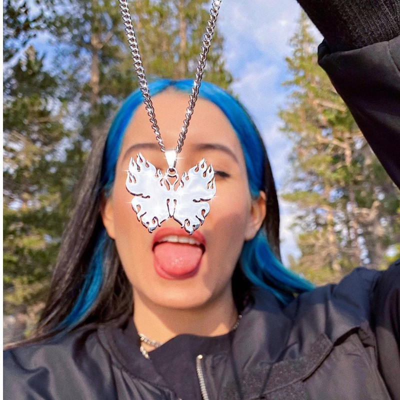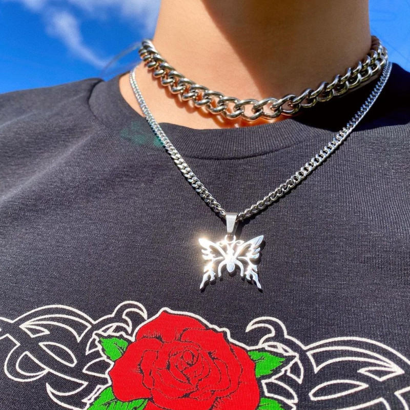 Crafted from durable titanium steel, this necklace exudes strength while maintaining a sleek, contemporary appeal. The hollow butterfly pendant, adorned with intricate tribal patterns, is the standout feature that catches the eye, while the Y2K-inspired design adds a nostalgic, yet modern flair. Whether you're into hip-hop fashion, tribal jewelry, or simply love unique pieces that make a statement, this necklace is the perfect addition to your collection.