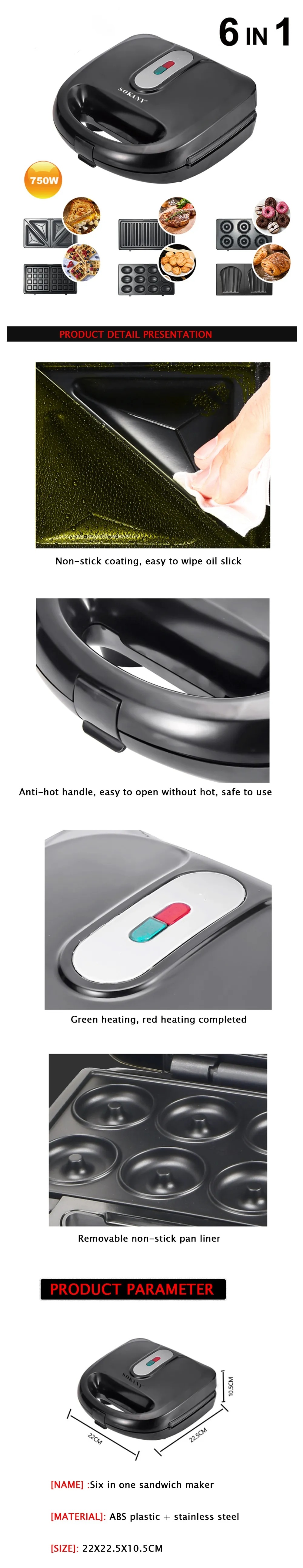 6-in-1 sandwich maker, we offer you 6 different detachable cooking plates for you to grill various delicious food.