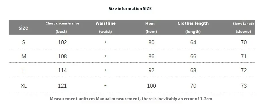Nota: 1. Las tallas asiáticas son 1 o 2 tallas más pequeñas que las europeas y americanas. Si su talla está entre dos tallas, elija la más grande. Puede haber una diferencia de 2 a 3 cm debido a la medición manual. 2. Consulte la tabla de tallas cuidadosamente antes de comprar. Si no sabe cómo elegir la talla, póngase en contacto con nuestro servicio de atención al cliente. 3. Como sabe, los colores se muestran de forma diferente en cada ordenador, por lo que el color real del artículo puede variar ligeramente del de las siguientes imágenes.