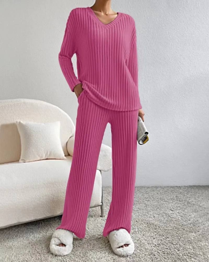 Traje de rayas lisas de moda con cuello en V, camiseta de manga larga y pantalones rectos casuales, ropa de mujer de temperamento holgado