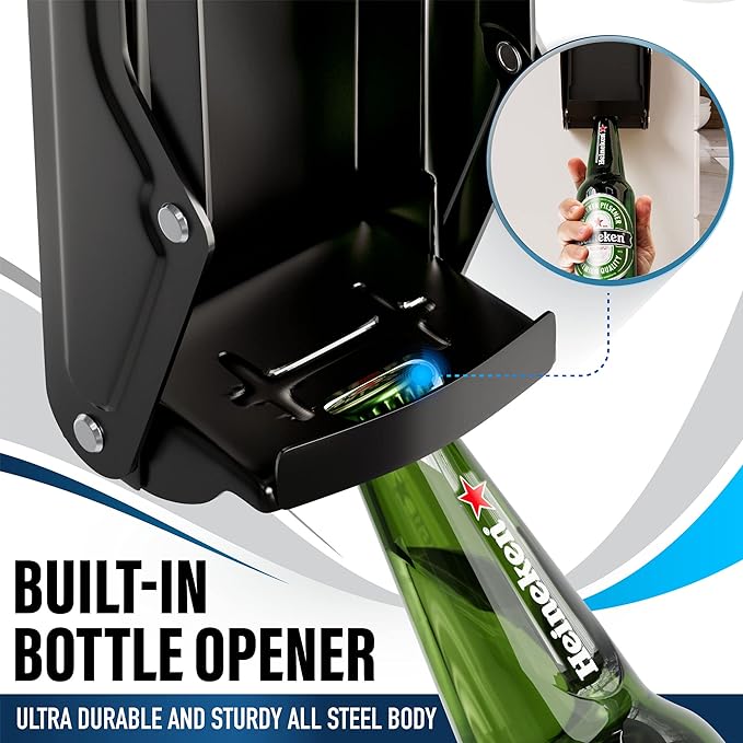 - DISEÑO: Herramienta de extracción con agarre suave, fácil y segura, que comprime completamente el metal a aproximadamente el 20% de su tamaño original, ahorrando valioso espacio de almacenamiento. Botella de regalo. El abridor se encuentra en la parte inferior de la herramienta para facilitar el acceso. Se instala verticalmente en los montantes de la pared con los tornillos incluidos.