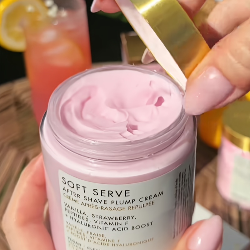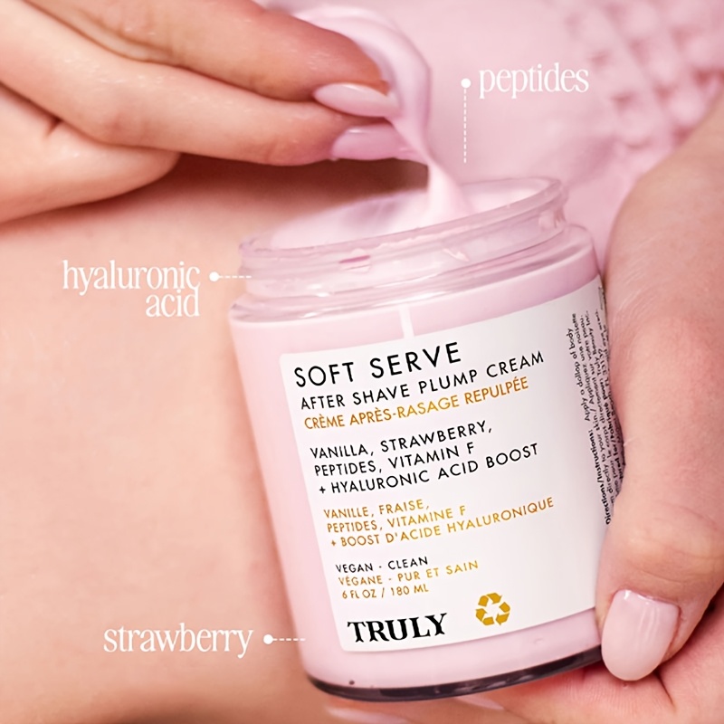 A luxurious after-shave body cream designed to comfort freshly shaved skin while delivering a soft, smooth, visibly plumped finish. The product shown is TRULY Soft Serve After Shave Plump Cream, presented in a premium jar and highlighted for its indulgent scent profile and skin-conditioning blend: vanilla + strawberry, peptides, vitamin F, and a hyaluronic acid boost. It is also labelled Vegan and Clean, making it an ideal choice for those who want a pampering post-shave step that supports hydration, comfort, and a more supple-looking glow.