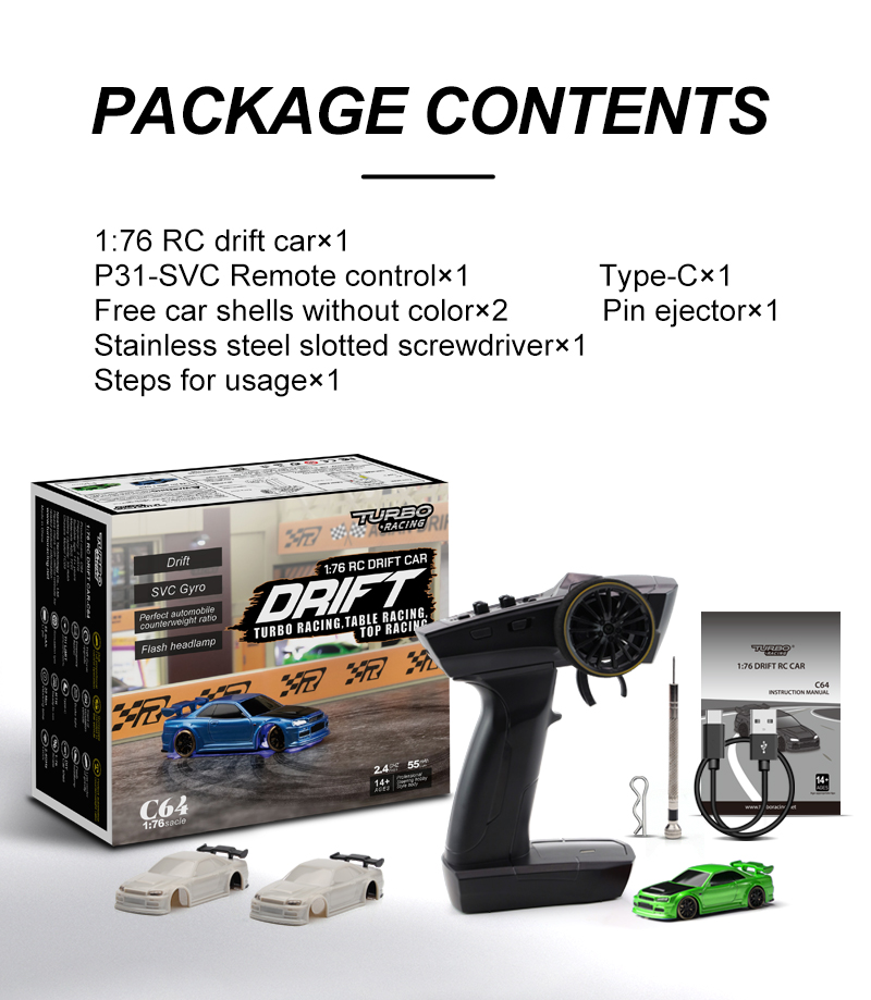 The C64 Drift RC car is an RTR kit, meaning it comes fully assembled and ready to run straight out of the box. It features a compact size, perfect for both indoor and outdoor use, and is suitable for both kids and adults who want to experience the excitement of RC drifting and racing.