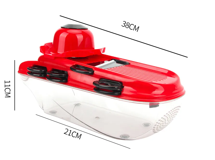 Composición: 7 cuchillas + 1 cuerpo cortador de verduras + 1 recipiente para PET + 1 protector de mano