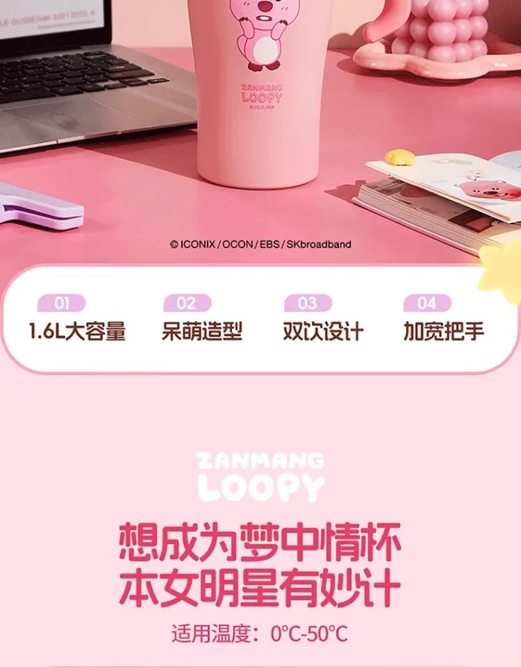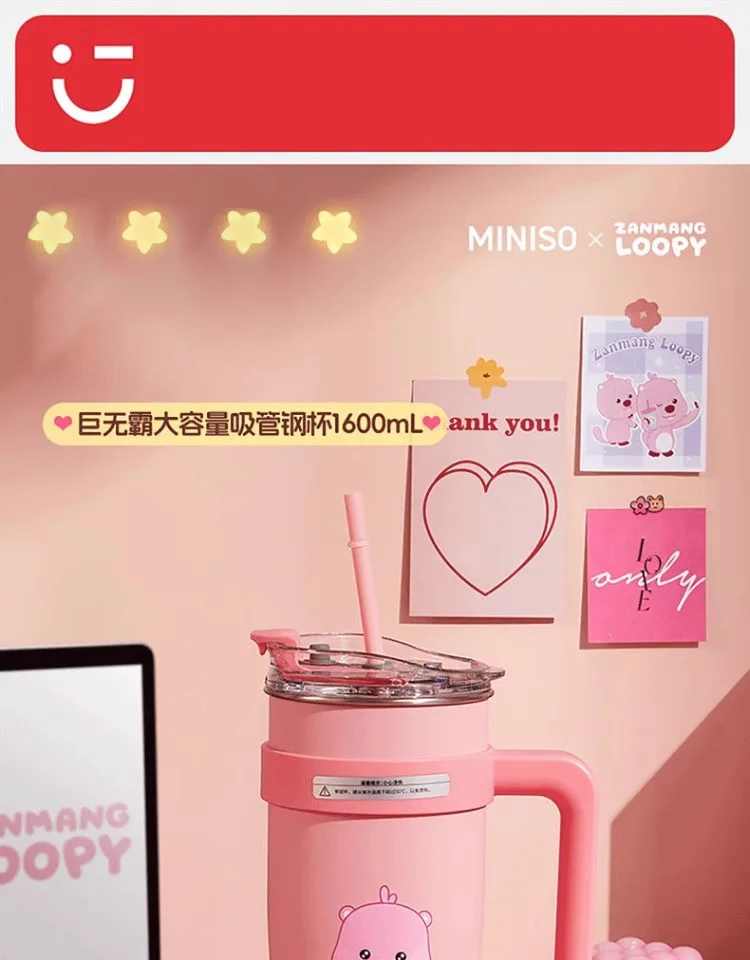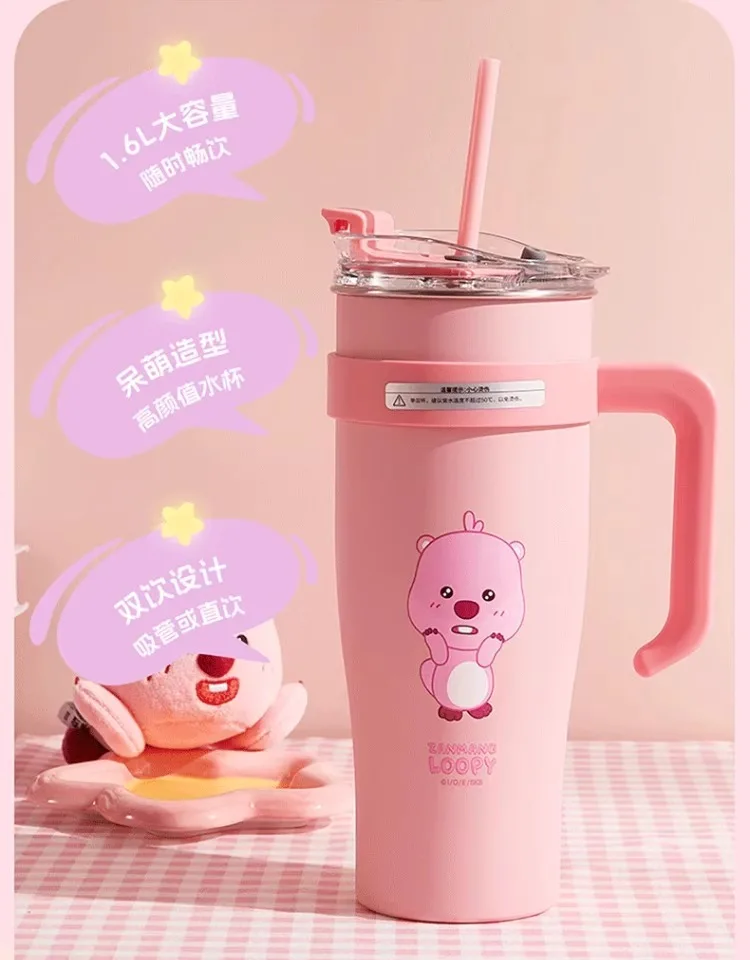 Vaso con pajita MINISO Loopy Series Jumbo de gran capacidad, bonito vaso para niñas, de acero inoxidable de alta calidad, capacidad de 1,6 l