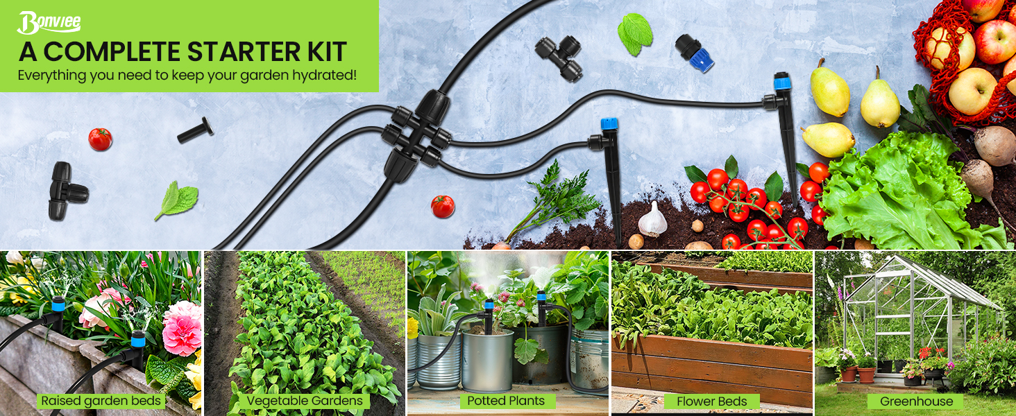 - 💧 230FT Complete Drip Irrigation Kit – Covers Your Entire Garden. This drip irrigation kit includes 230FT of high-quality tubing (1/4” & 5/16”), adjustable drip emitters, and everything you need for a customized garden drip irrigation system. Whether you have raised garden beds, flower pots, a greenhouse, or a lawn, this kit ensures your plants get the perfect amount of water.