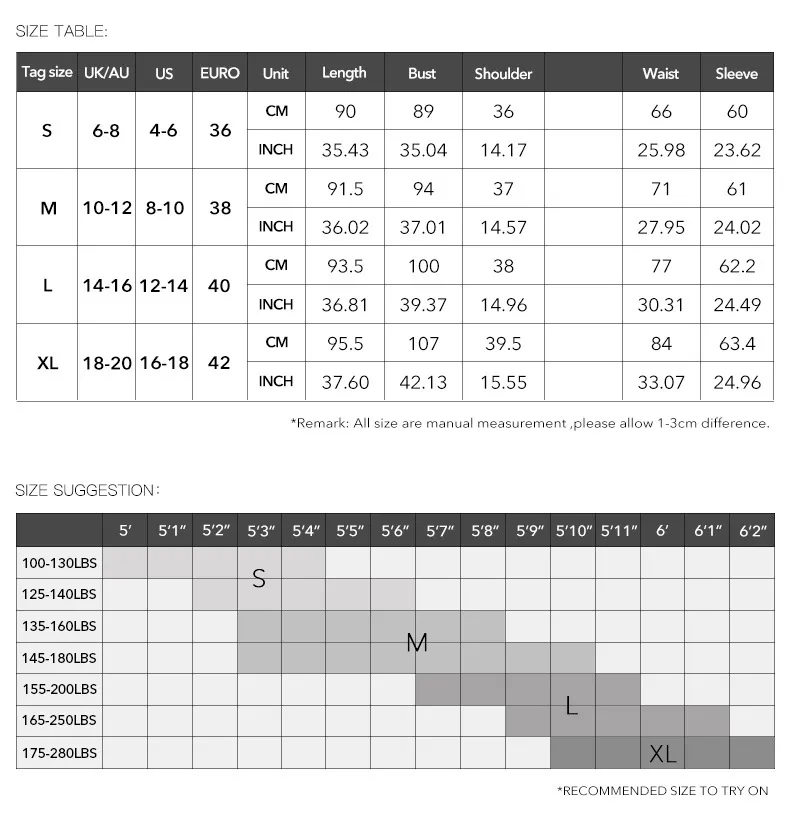 Nota: 1. Las tallas asiáticas son 1 o 2 tallas más pequeñas que las europeas y americanas. Si su talla está entre dos tallas, elija la más grande. Puede haber una diferencia de 2 a 3 cm debido a la medición manual. 2. Consulte la tabla de tallas cuidadosamente antes de comprar. Si no sabe cómo elegir la talla, póngase en contacto con nuestro servicio de atención al cliente. 3. Como sabes, los colores se muestran de forma diferente en cada ordenador, por lo que el color del artículo real puede variar ligeramente del de las siguientes imágenes.