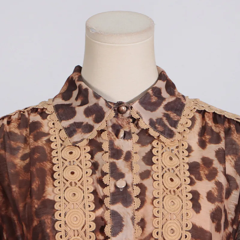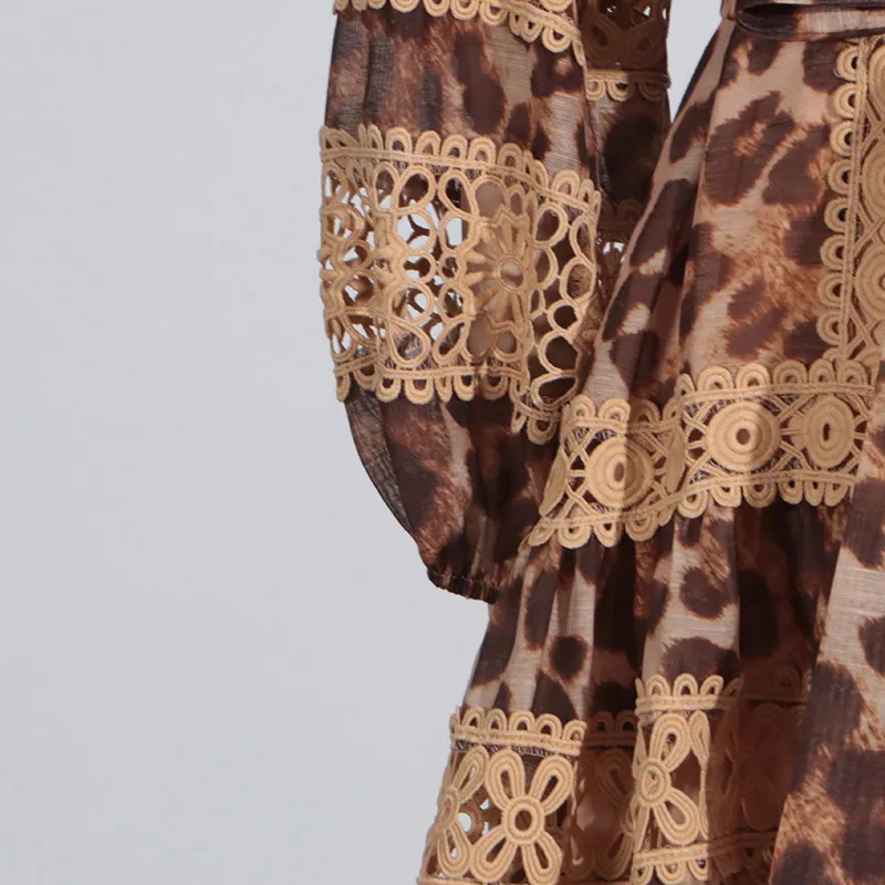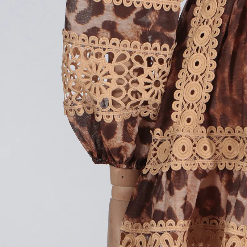 Vestido de manga larga con estampado de leopardo calado para mujer