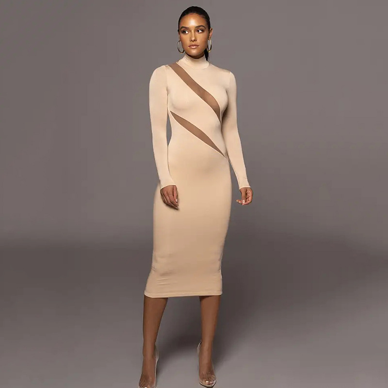 Este vestido se puede combinar de múltiples maneras para adaptarse a diferentes ocasiones. Combínalo con botines y una chaqueta de cuero para un look otoñal chic, o vístelo con tacones y joyas llamativas para una salida nocturna. Los tonos neutros facilitan la combinación con accesorios, lo que te permite crear infinitas combinaciones de atuendos.