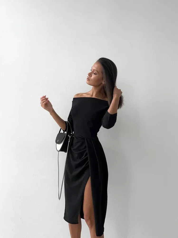 Sumérgete en la elegancia atemporal con el Vestido de Manga Larga con Cuello Descubierto y Abertura en la Cintura para Mujer, una combinación perfecta de estilo chic y diseño sofisticado. Este impresionante vestido presenta un escote descubierto que enmarca hermosamente los hombros y la clavícula, añadiendo un toque de sensualidad a su look. Las mangas largas brindan cobertura y una silueta refinada, lo que lo hace ideal para noches frescas o eventos formales. Diseñado para favorecer, la cintura ajustada realza tu figura, mientras que la abertura a la altura del muslo añade un toque sutil pero atractivo, permitiendo libertad de movimiento y un toque extra de glamour. Confeccionado con tela transpirable de alta calidad, el Vestido de Manga Larga con Cuello Descubierto y Abertura en la Cintura para Mujer ofrece comodidad y elegancia. El detalle de la abertura en la cintura realza el atractivo moderno del vestido, mientras que el diseño elegante y minimalista lo convierte en una pieza versátil que puede pasar fácilmente del día a la noche. Perfecto para cenas formales, cócteles o veladas, este vestido irradia sofisticación con un toque atrevido. Combínalo con tacones altos y joyas llamativas para un look de noche inolvidable, o con accesorios minimalistas para un look más discreto y chic. Diseñado para mujeres que aprecian el estilo y la comodidad, este vestido es imprescindible en cualquier armario. La combinación de escote abierto, mangas largas y una atrevida abertura crea un look equilibrado y refinado, perfecto para cualquier ocasión. Ya sea que asistas a un evento de alta gama o busques un vestido impresionante para salir por la noche, el vestido de mujer con abertura en la cintura y manga larga con cuello descubierto ofrece la combinación perfecta de clase y encanto, lo que garantiza que dejes una impresión duradera.