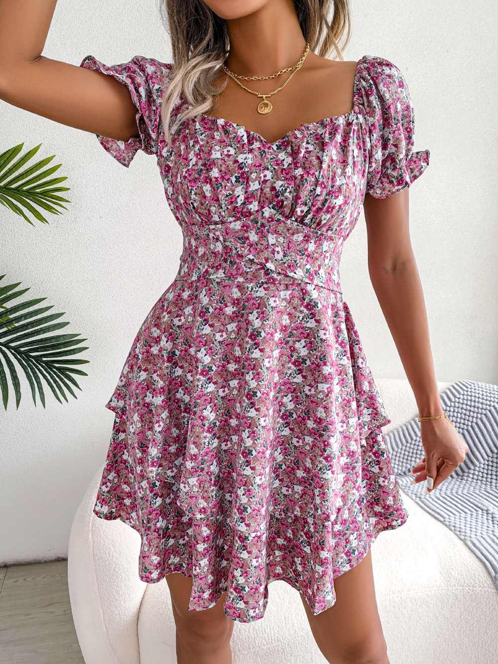 Vestido mini para mujer, temperamento, gran vuelo, dobladillo suelto, estampado floral, fruncido, manga corta, cintura alta, vestido de verano, ropa