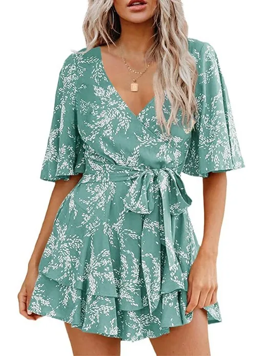 Vestido plisado con cinturón, mangas acampanadas y escote en V floral