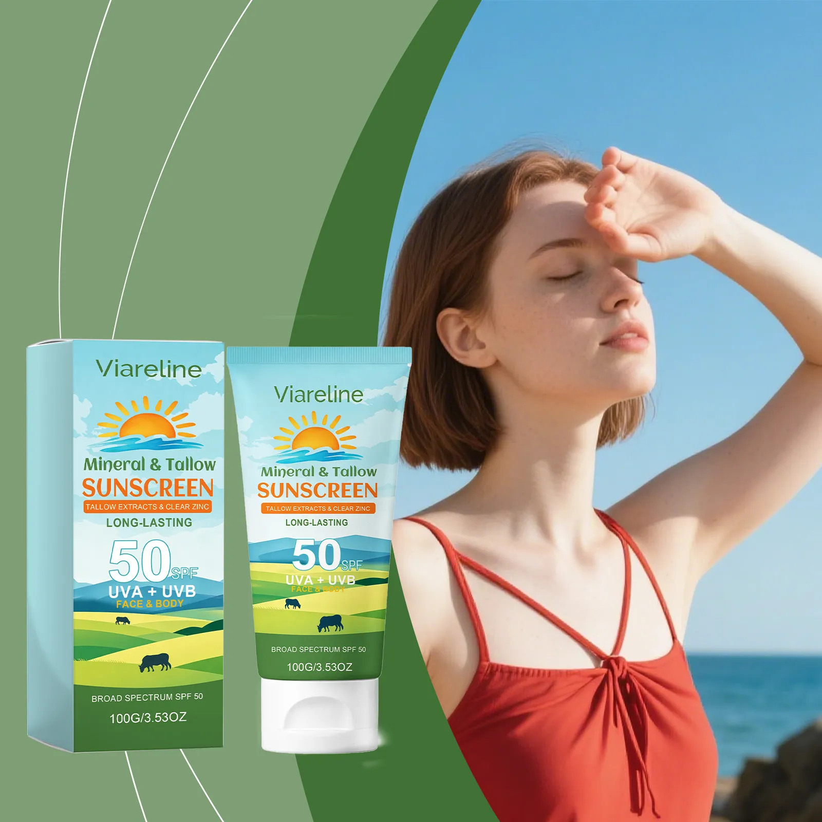 Viarelina Mineral & Tallow Sunscreen, sunscreen SPF 50, broad-spectrum sunscreen, UVA and UVB protection, mineral sunscreen, sunscreen for face and body, clear zinc sunscreen, nourishing sunscreen